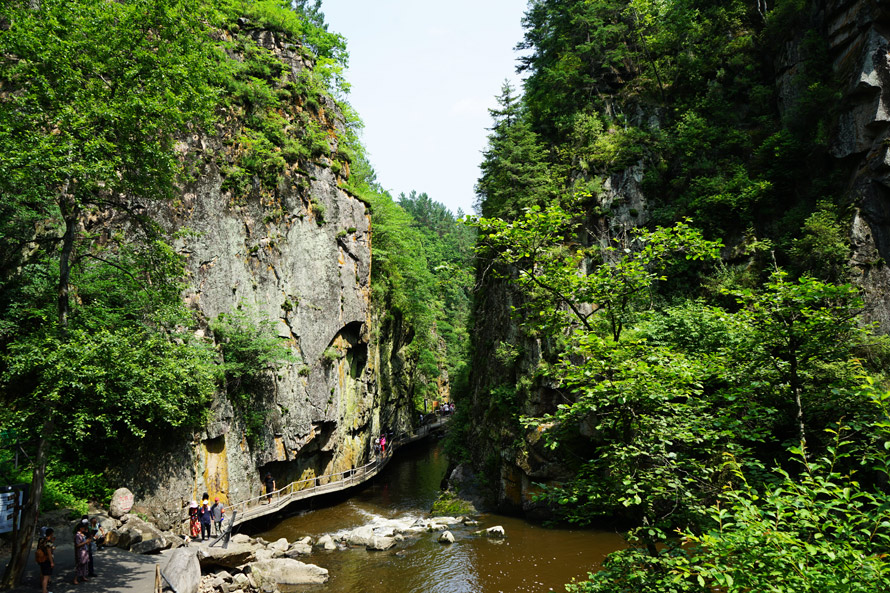 茅兰沟谷据地质学家考证,这是亿万年前地壳变迁、褶皱断裂形成的一道深谷。由于没有人为的开垦采伐和商业活动,茅兰沟一直保持着原始风貌,不仅有大面积的原始森林和天然次生林,还有种类繁多的花草植物,一山一水、一草一木都显得粗犷随性。游客在沟谷内行走,多半时间都是沿河相伴而行,越往里走,山林越显宁静,即便是身边人群汹涌,也还是觉得静,仿佛亿万年前的时间都黏在了绿叶草间水滴之上,只要闭上双眼,就能毫不费力地回到亘古久远的天地洪荒之中。