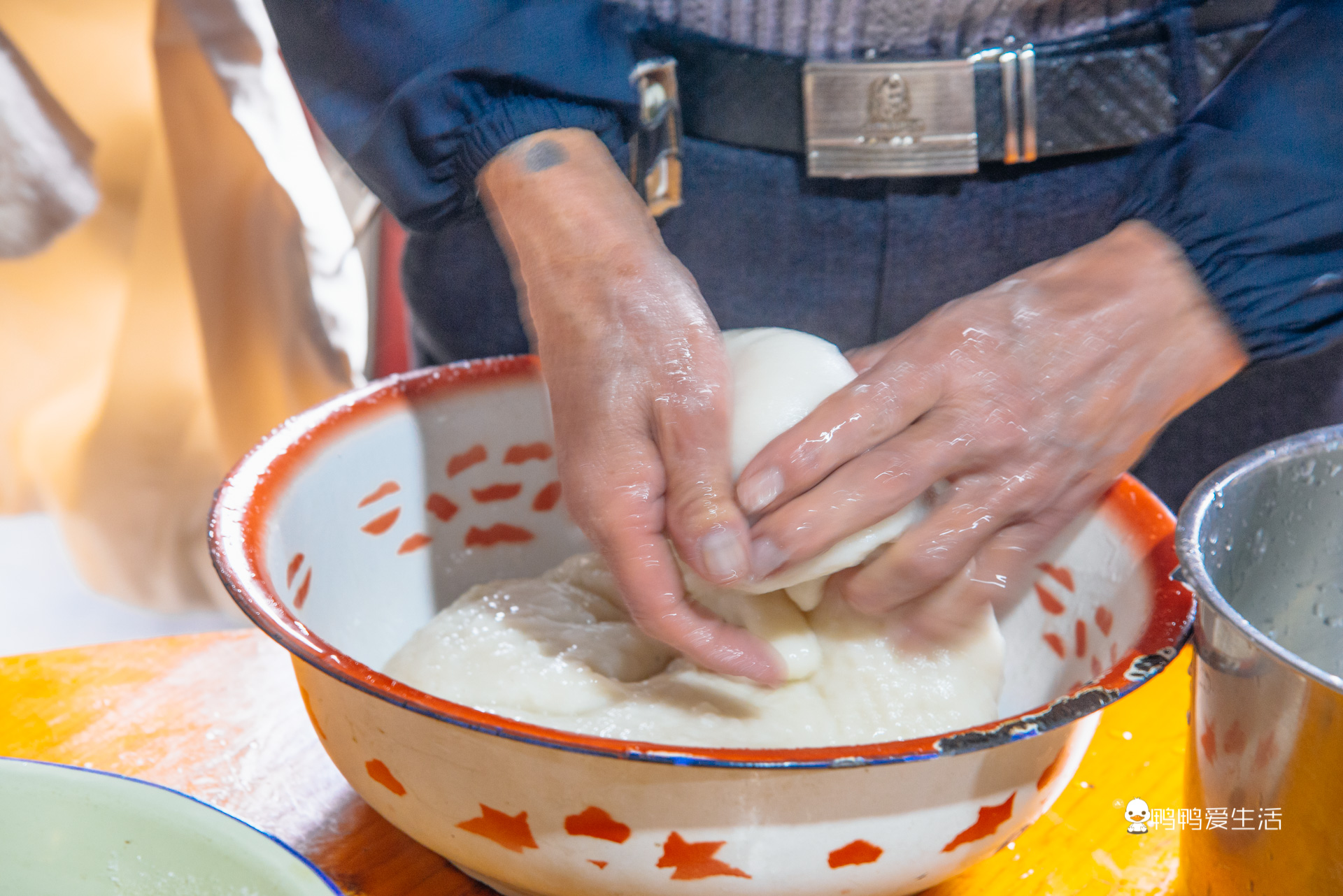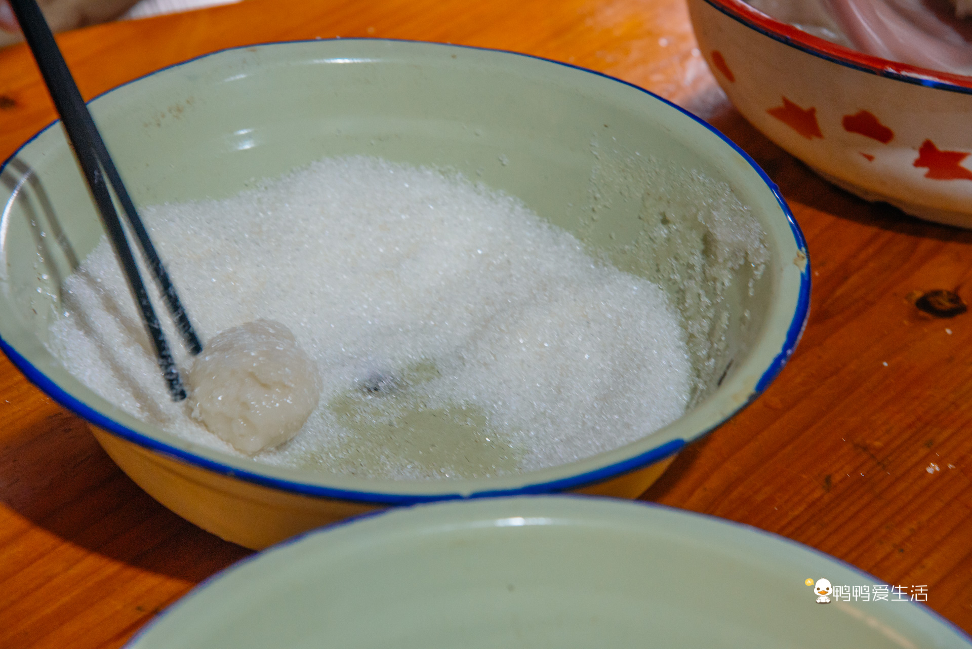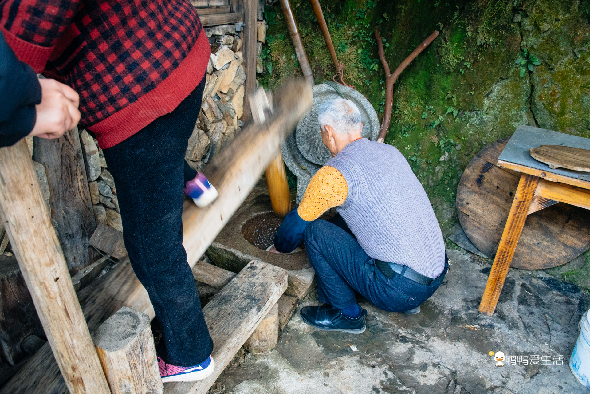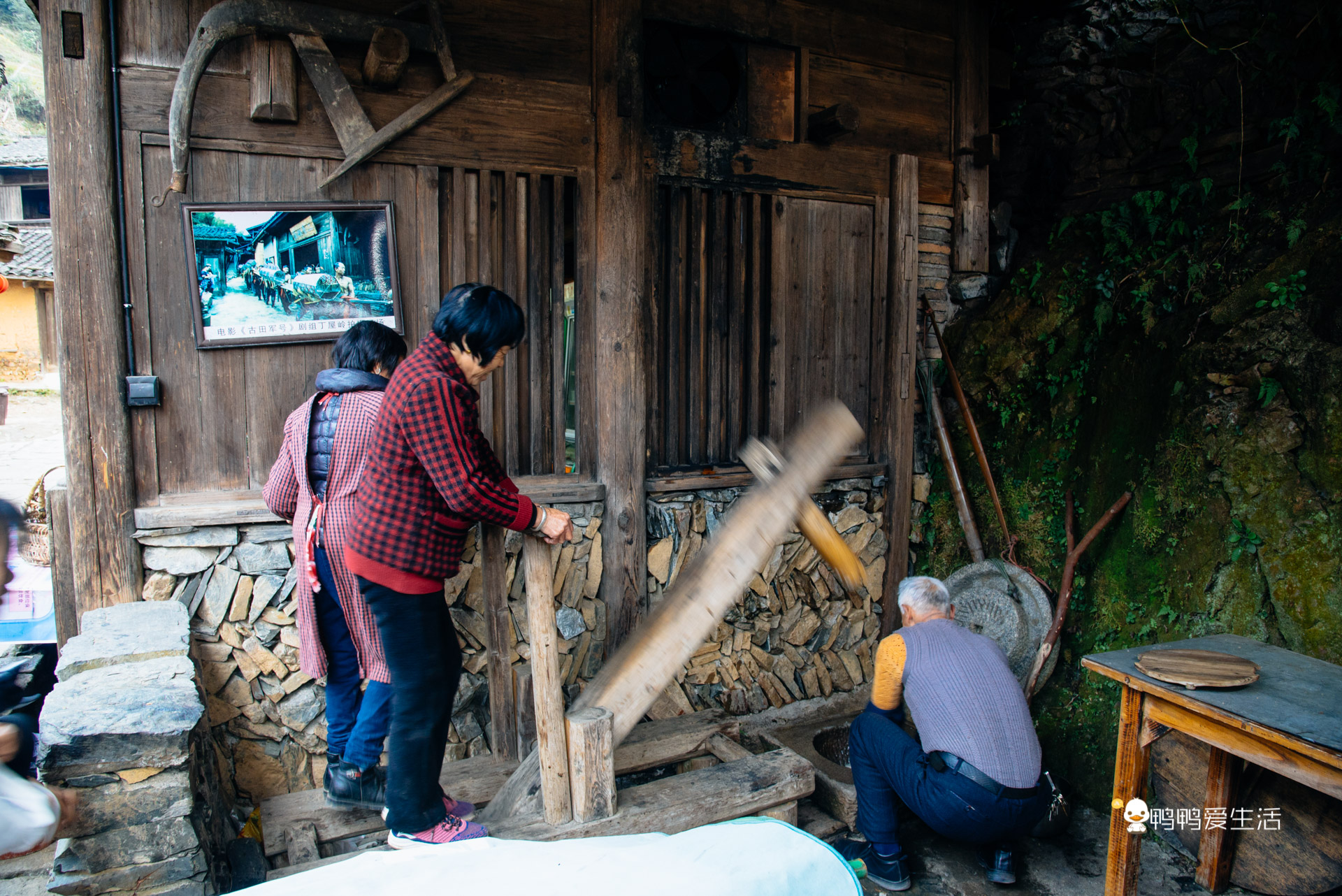 走累了可以来村中央的这个三秀饭店歇歇,偶遇村民正在打糍粑。看着轻巧的动作,其实考验的是配合度和力度,一个类似跷跷板一样的工具,一端要两个人甚至三个人才能踩下,另一端还有一人要不断翻动糯米团子,便于排气也使得糯米团打得更加均匀。打好后的糍粑用手一个个捏成小团子,在白糖里打个滚就可以上桌吃了哦,香糯可口!