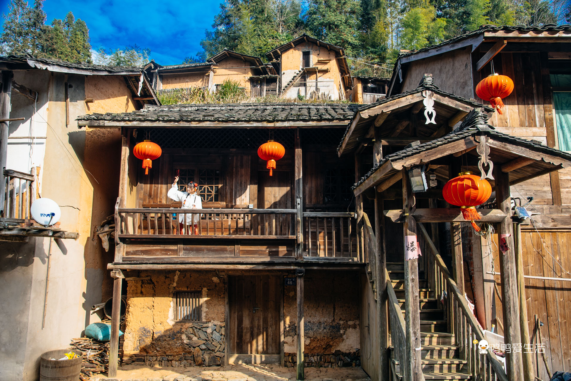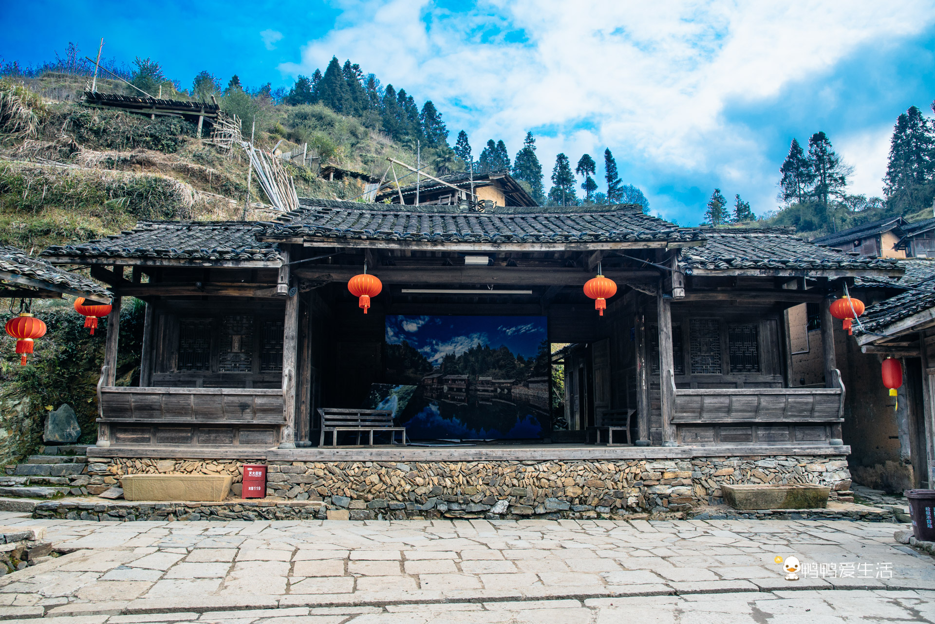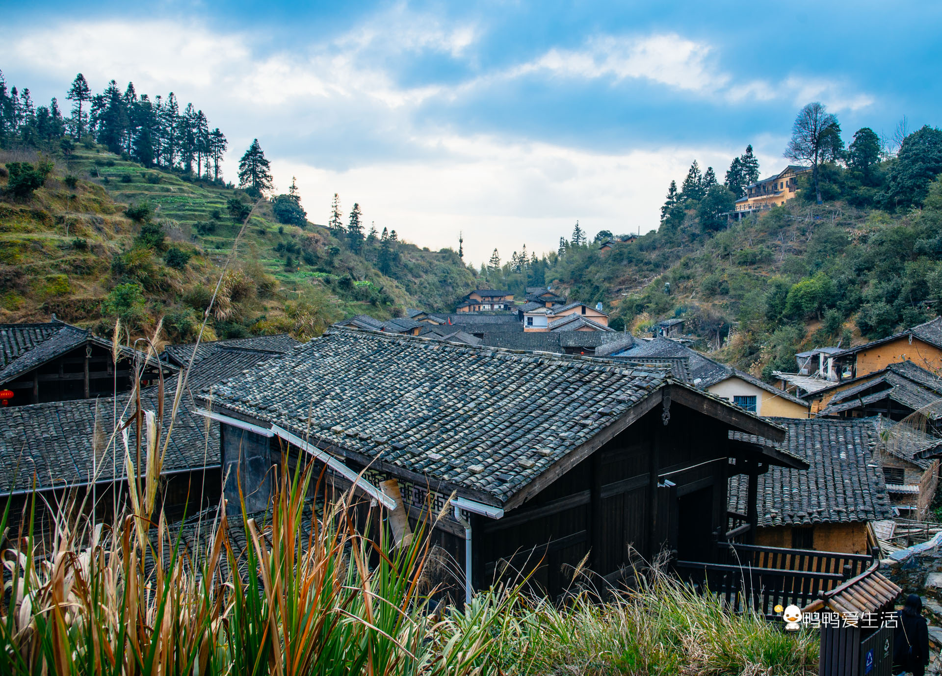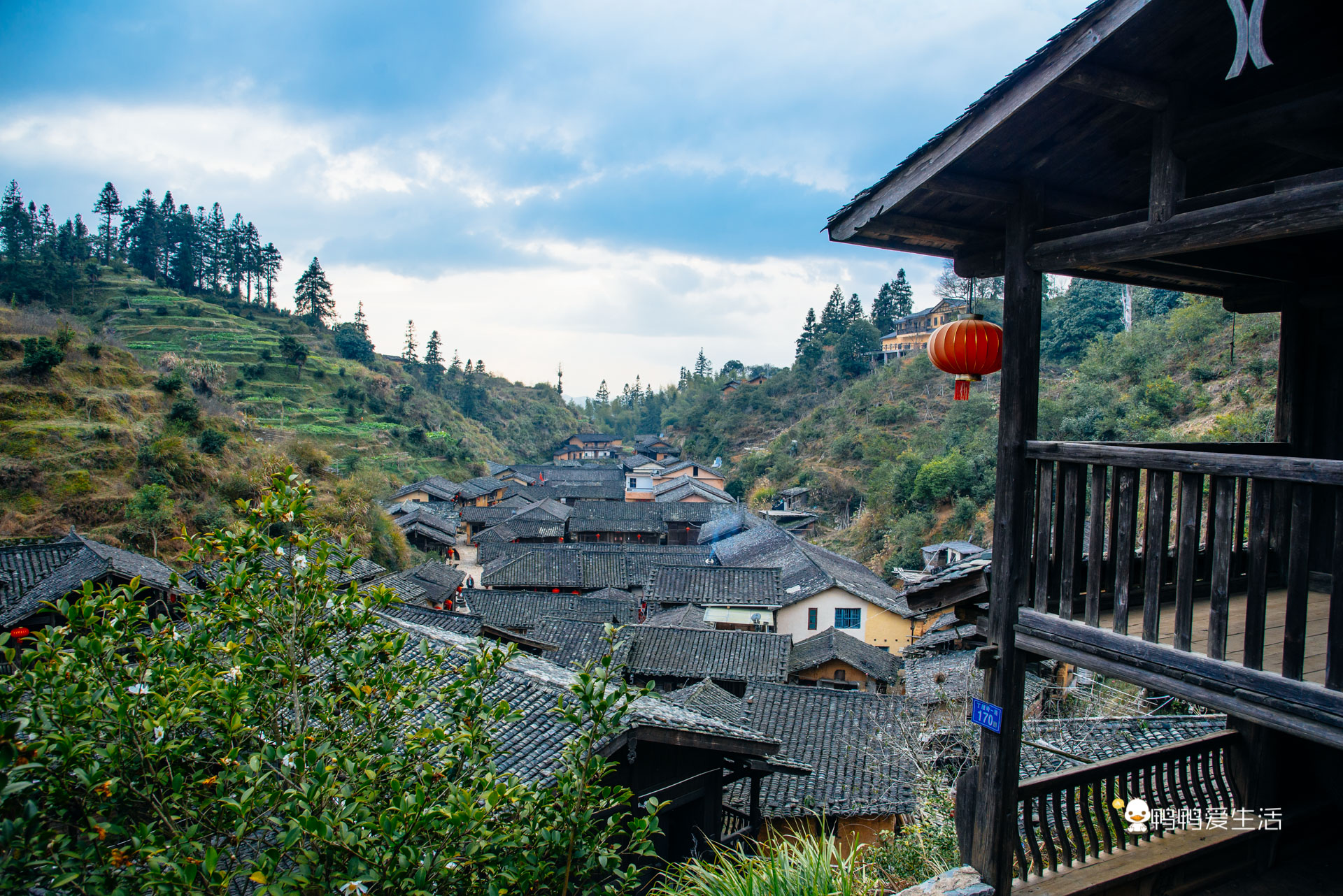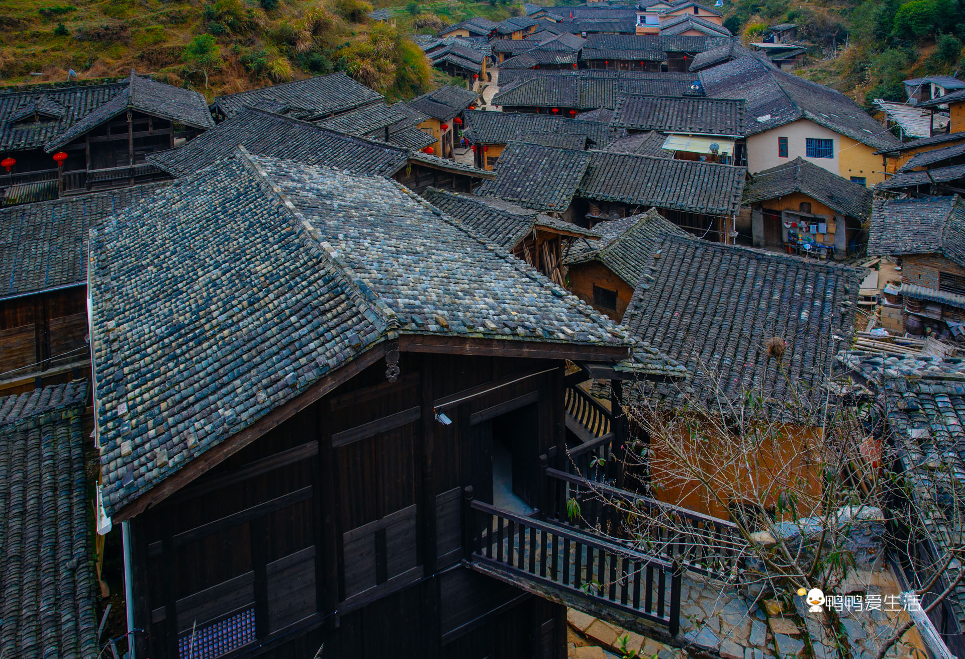 沿着石板路可以一路往上走到高处的观景台,从高处俯瞰整个村庄,黑色的屋顶错落有致,傍晚时分,村落里开始升起了袅袅的炊烟,一瞬间看呆了,实在太美了!