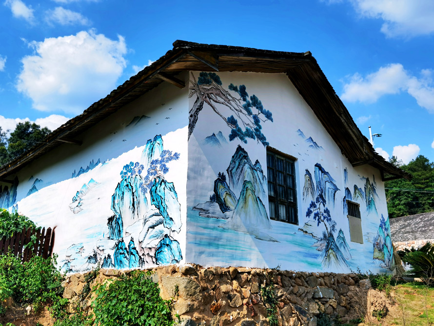 这里有两个画室村庄比较出名,一个是新河画村,一个是乌石画村,那天,我去了新河画村,房屋还是村子里那些房屋,不同的是外墙全部是白灰刷就,上面画着各种山水花鸟和农耕劳作图画,看起来赏心悦目,吸引了一批又一批游客前来打卡。