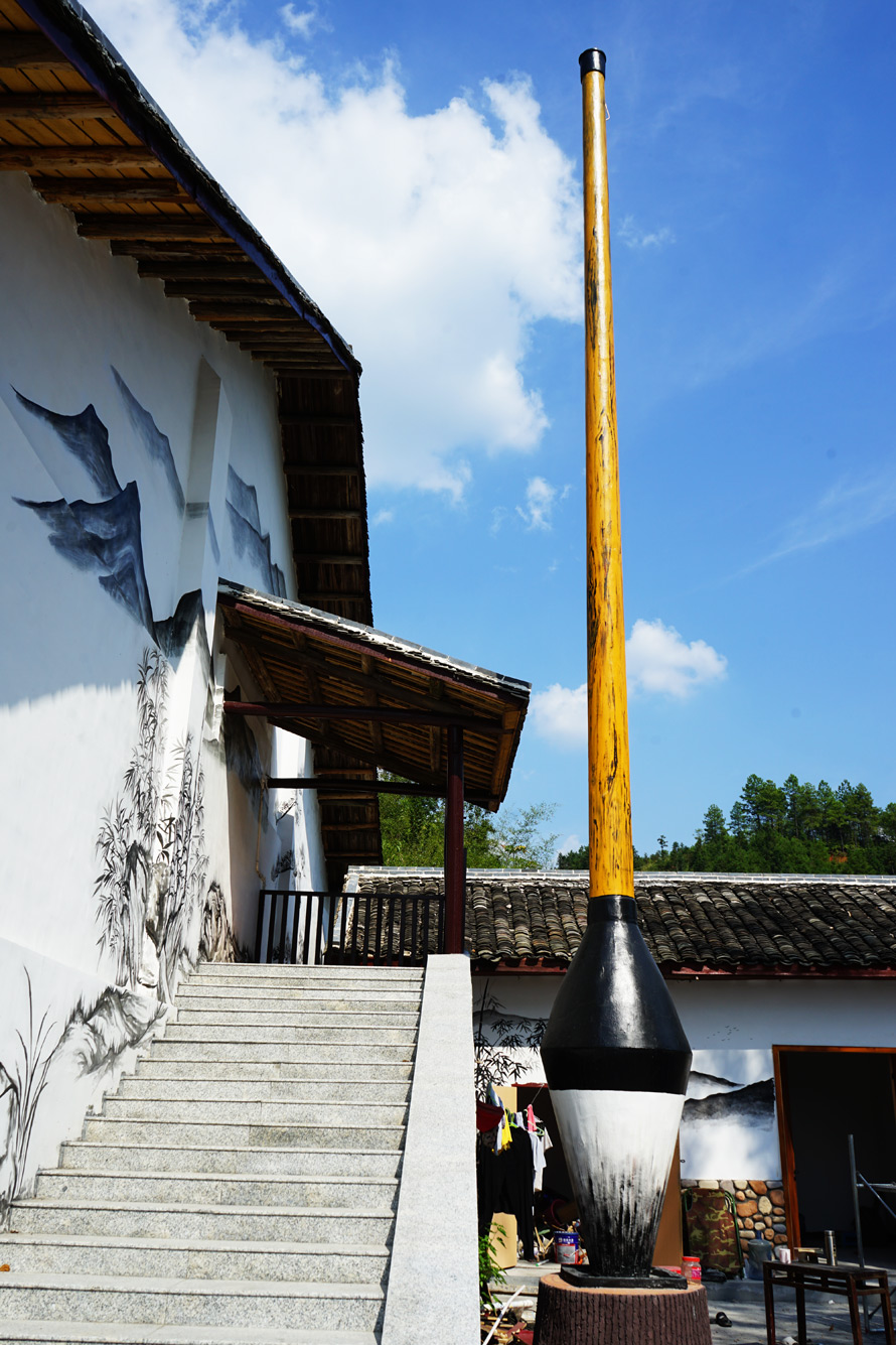 湖南卫视《云上的小店》节目就是在新河画村拍摄制作完成,我那天在这里的时候,拍摄用的房屋还没有粉刷完成,房屋是两层小楼建筑,房间大概有十几间的样子,施工人员还在安装门框和绘制图画,院子中有一根巨大的毛笔,矗立在天地之间。
