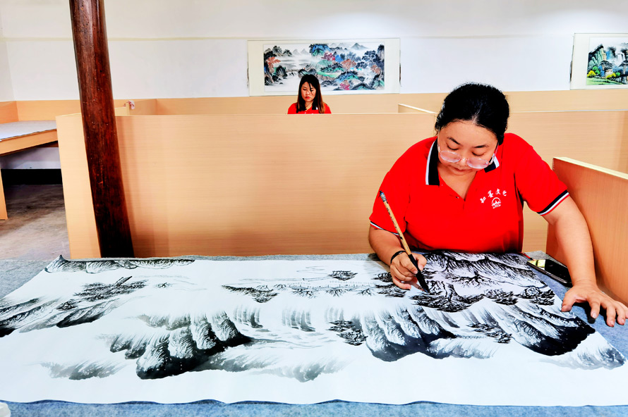 新河画村的作品主要是返乡创业本地农民为主导,以创作国画为主,其中创意画更多的是就地取材,如采用泥巴、木屑、鞭炮筒、树叶等农村常见材料进行创作,画作精致精美,作品主要销往桂林国画集散中心,农民画师经3个月左右培训即可上岗,分工负责画山水,画人物及上色等不同工序,主要进行,画师计件收入,按作品尺寸计价,画师可以获得3000—7000不等月收入,这收入估计远超地级市普通职工月收入了吧。