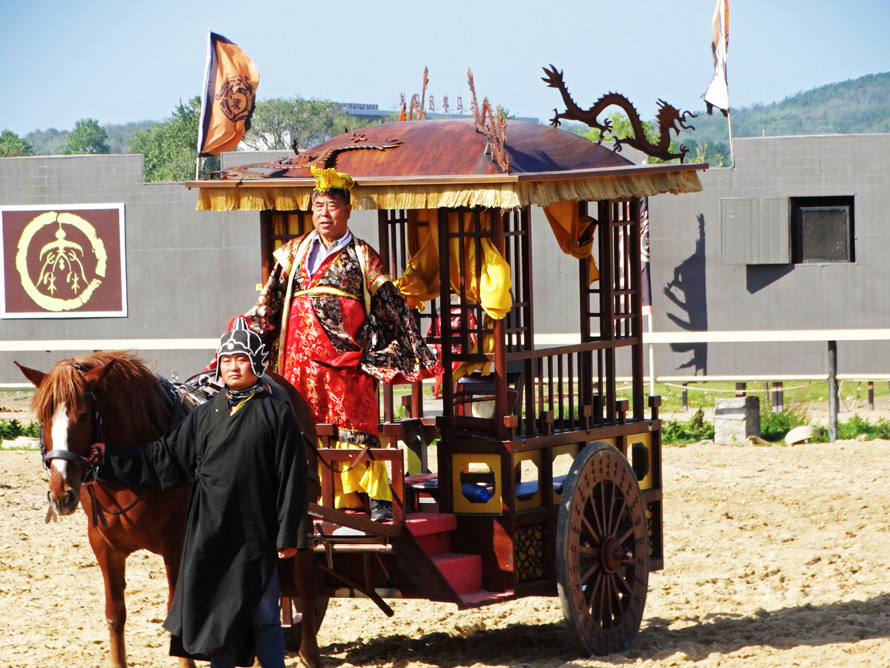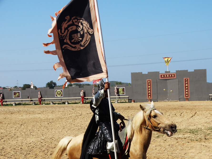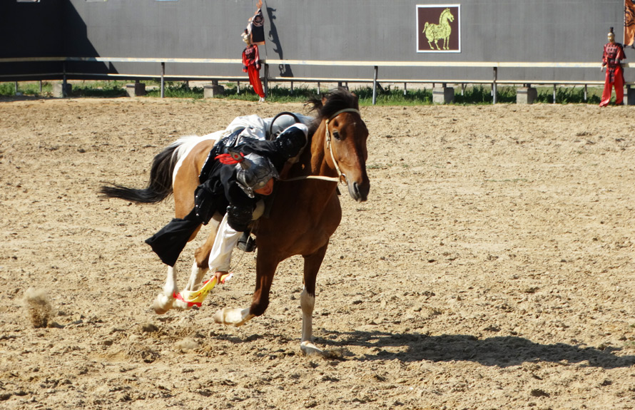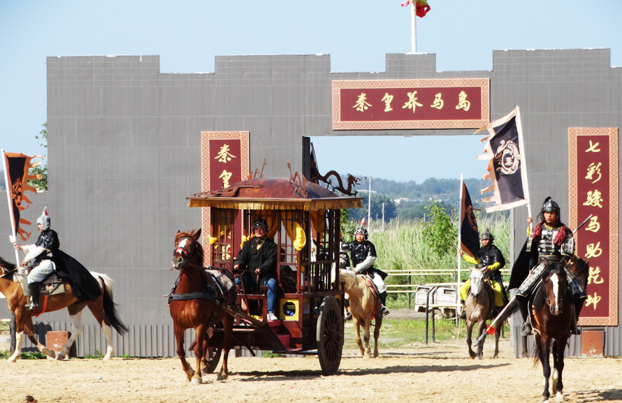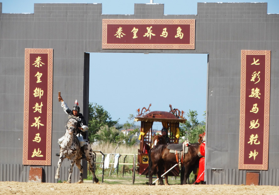 养马岛的养马场里每天固定时间会有一场古装庆典表扬,演员们扮演秦王巡视的模样和阵仗,在场地中巡游,还有骑手骑着骏马飞奔射箭,数十米开外一箭中地,一些骑手在飞奔的骏马上附身贴地捡拾刀剑,他们的表演真实而精彩。