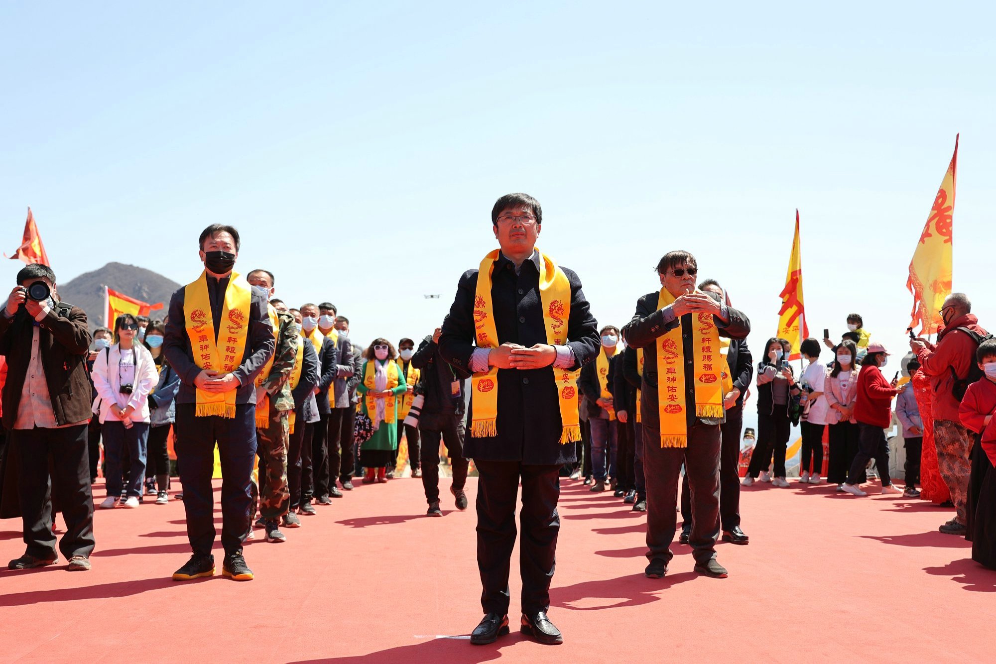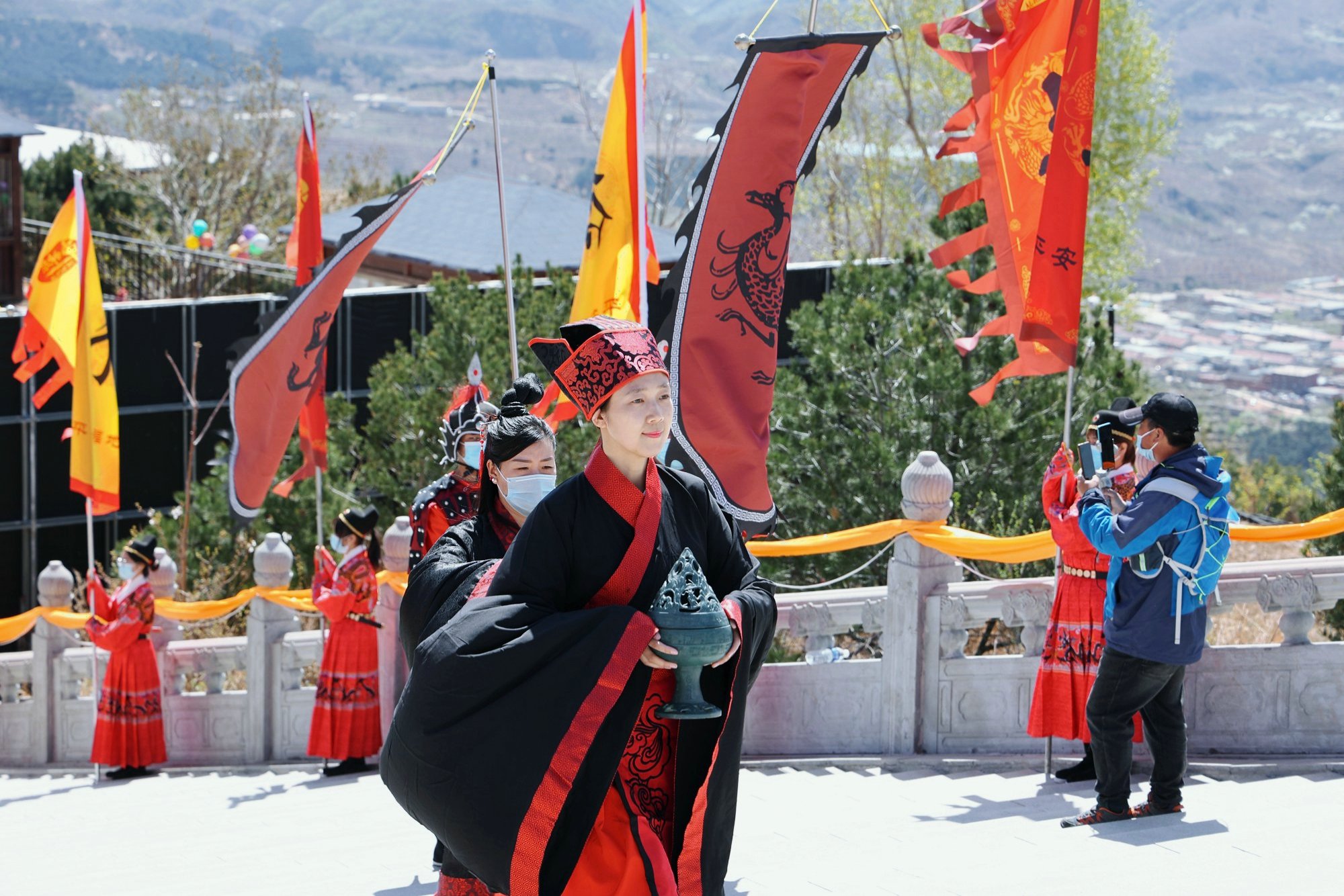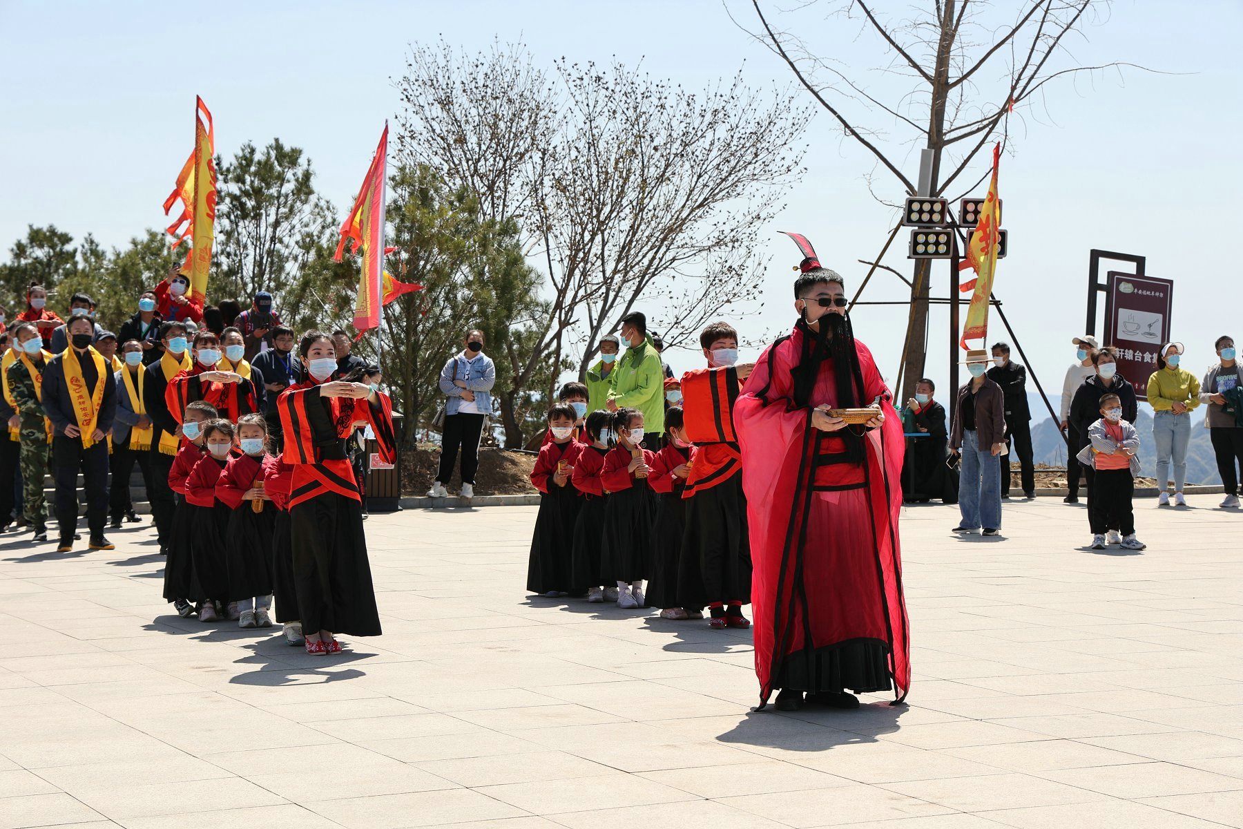 景区工作人员自己周边民宿业者,统一身着传统汉服,由执礼人员引领四圣旗、十常礼旗、汉服同袍和国风少年行至轩辕上广场,齐拜轩辕黄帝。主祭官净手献爵,上香;执礼人员带领参会代表行大揖礼;乔董事长宣读祝文……仪式庄严而盛大,再次向世人证明,民族的才是世界的!