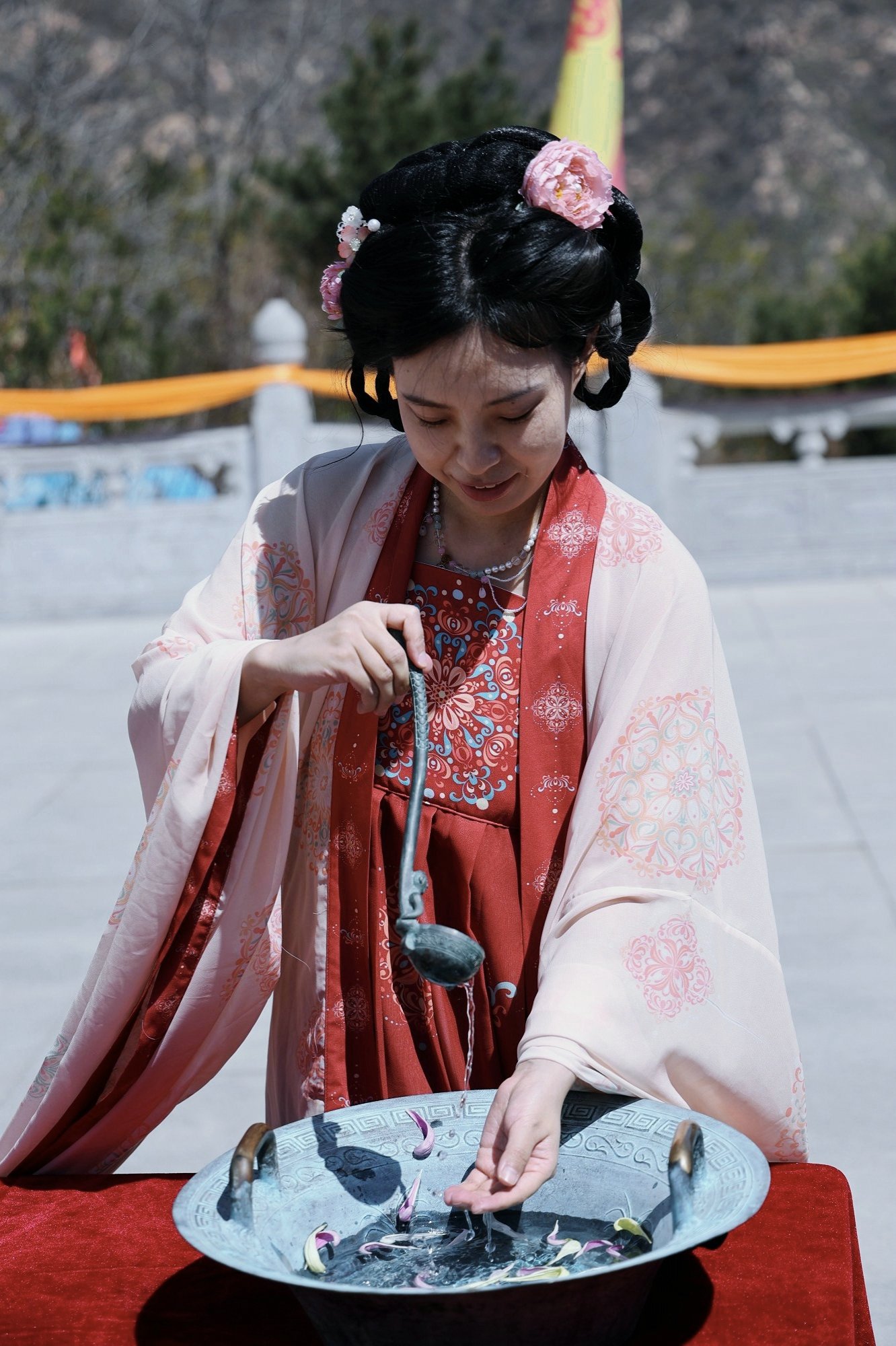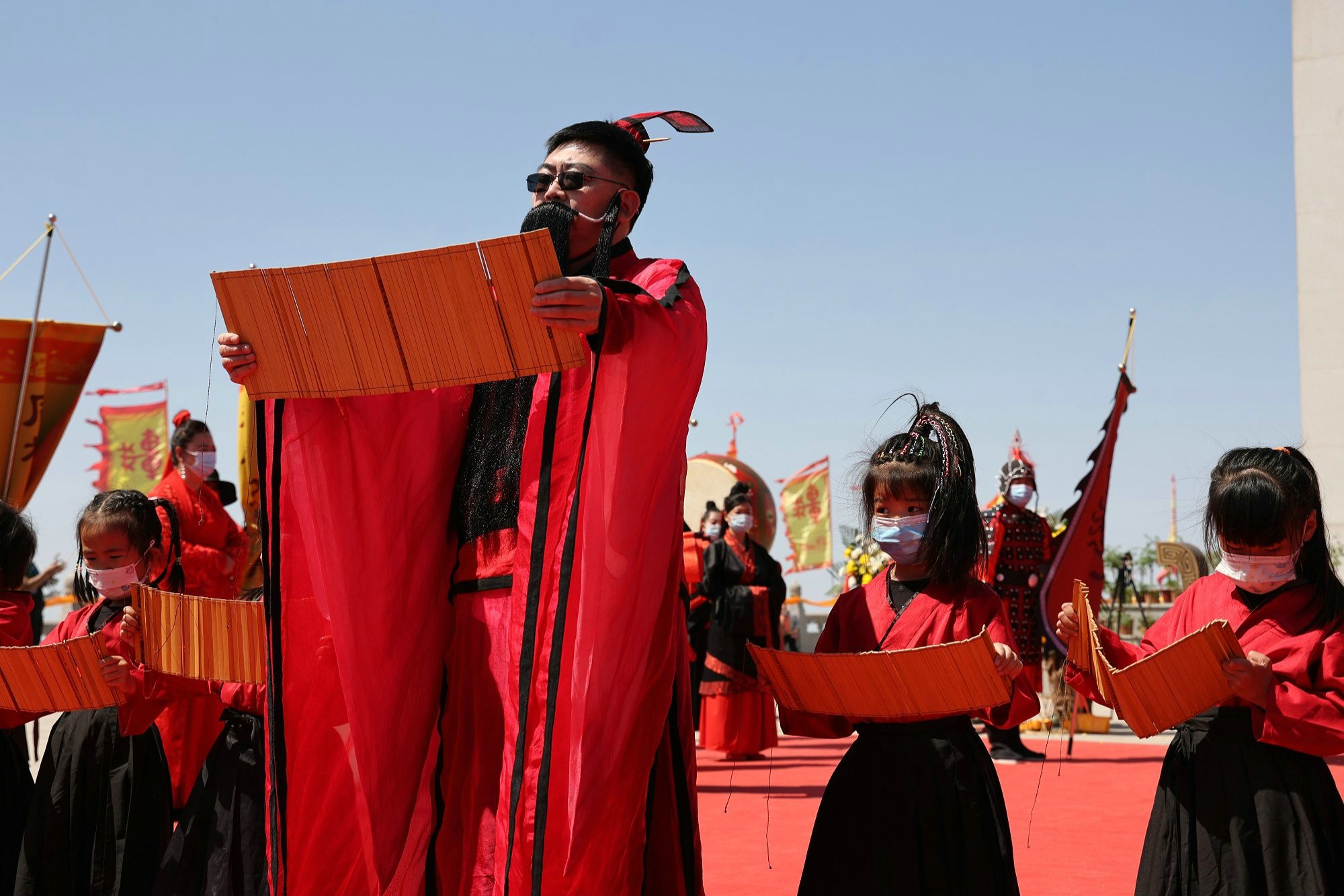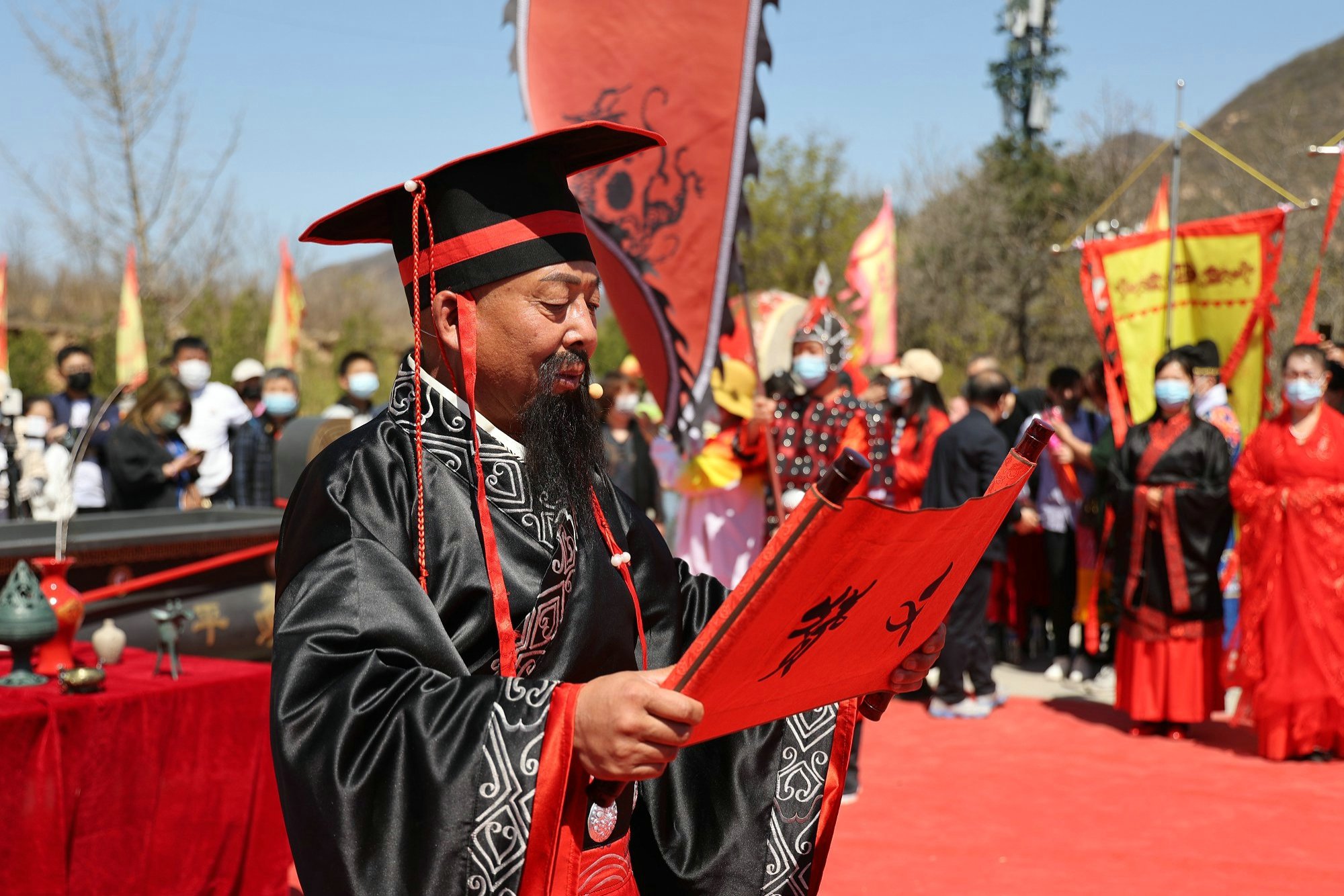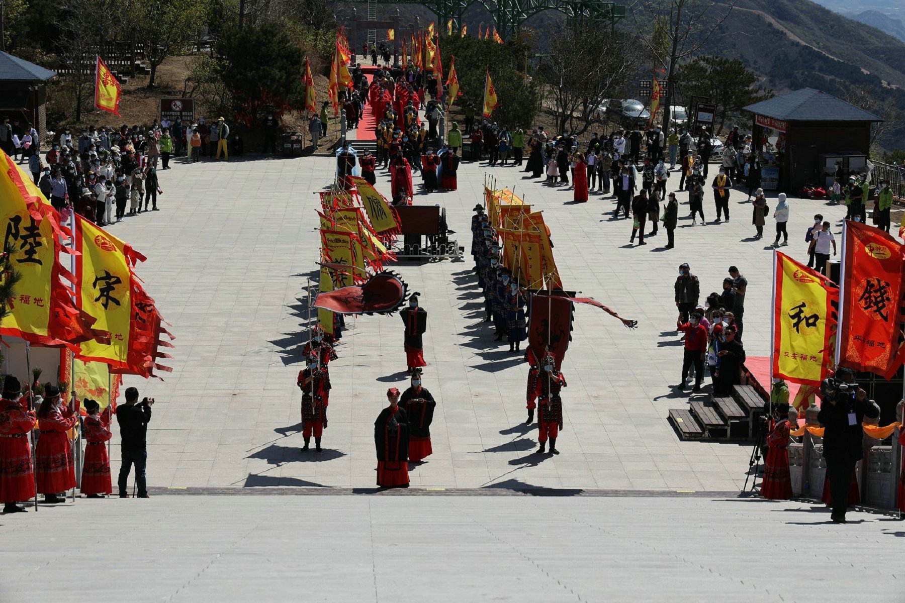 景区工作人员自己周边民宿业者,统一身着传统汉服,由执礼人员引领四圣旗、十常礼旗、汉服同袍和国风少年行至轩辕上广场,齐拜轩辕黄帝。主祭官净手献爵,上香;执礼人员带领参会代表行大揖礼;乔董事长宣读祝文……仪式庄严而盛大,再次向世人证明,民族的才是世界的!