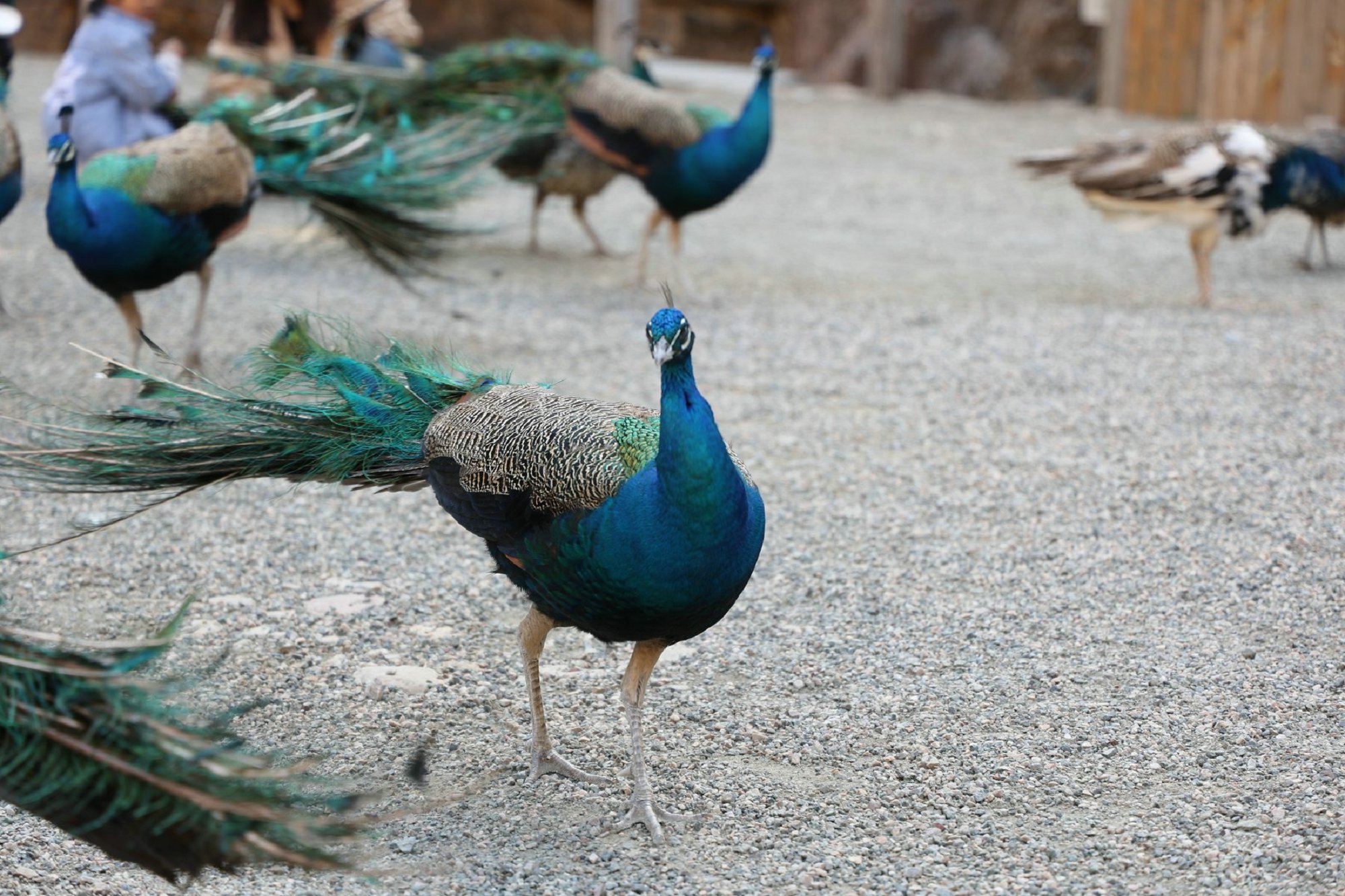 与孔雀互动是大人小孩都爱做的事,投食时要把控好距离,不然会把它们吓跑的。有幸看到孔雀开屏,是不是预示好事的发生呢?!