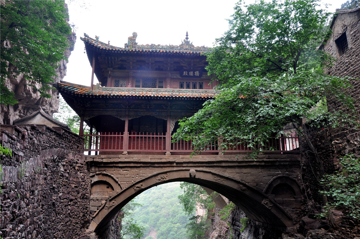 楼桥殿是一座修筑在两崖之间类似于桥梁的古建筑,据说为中国三大悬空寺之一。在这深山野岭之地,一座悬挂于两山之间的建筑如何建成是很多人的疑惑。楼桥殿南北各有天王殿和公主祠,统称为福庆寺。在峰峦之间,还散落着亭台、碑碣,值得细细地观赏、琢磨。景区曾经为国内多部电视剧拍摄的外景地,很多地方会有似曾相识的感觉。