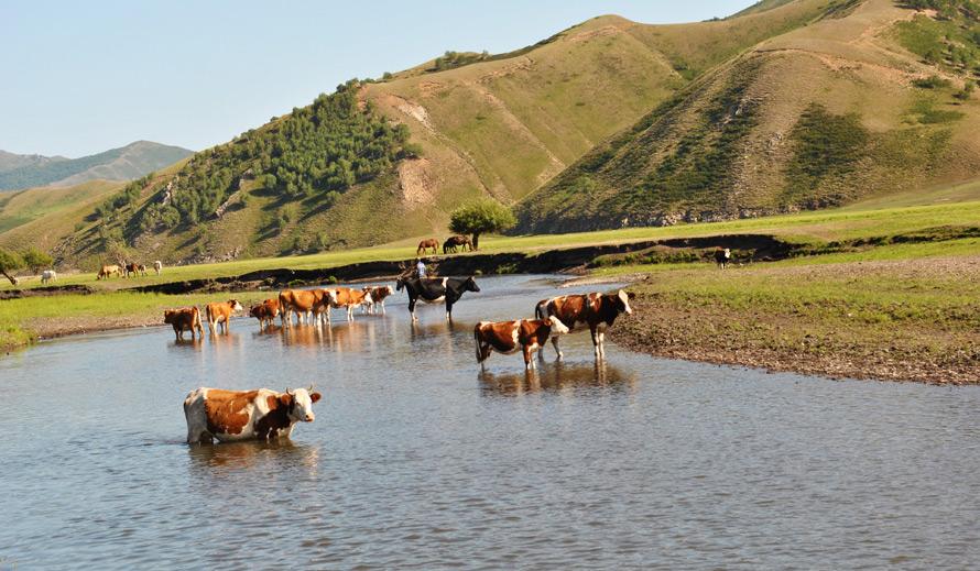 有三三两两的小牛在西拉木伦河中饮水,草原、山川、牛群、河流构成了一幅天然的动态画卷,令人赏心悦目。
