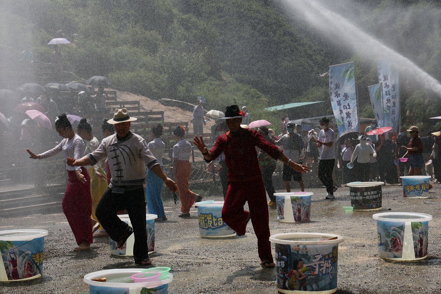 重头戏当然是泼水节的开始,爱ta就泼ta。游客与刚才表演的舞者们,用水枪、水盆各种能用上的工具,互相送上水的祝福。特别是当水车的水炮从两侧喷洒而下,场中的每个人都沐浴在清凉的水中,太畅快了!