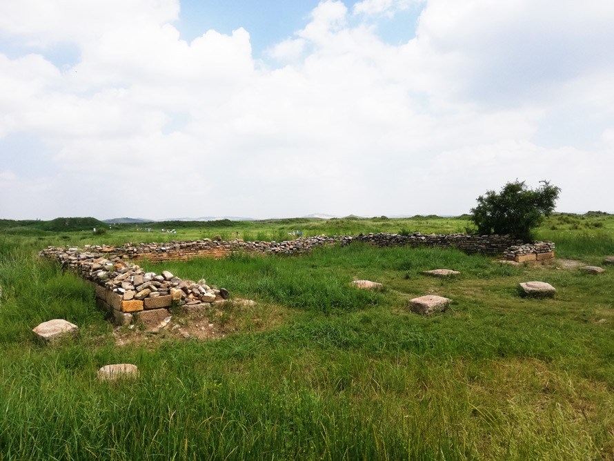 元上都遗址如今仅剩下城墙基石,宫城的正门城墙如是一条长长的夯土堆,中间是一条进城的道路。宫城正门又称“御天门”,是元上都当年举行“新闻发布会”的地方,也就是元朝皇帝有重大决策诏谕时,在这里举行隆重仪式宣读诏书,然后送往大都以及各地。