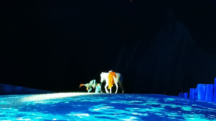 夜幕中,马震南山,热血沸腾的画卷就此展开,现场近距离高科技声电光影技术营造出草原上波澜壮阔的场景,将大家的记忆带回古代战争、唯美爱情、人马情感的历史长河之中。
