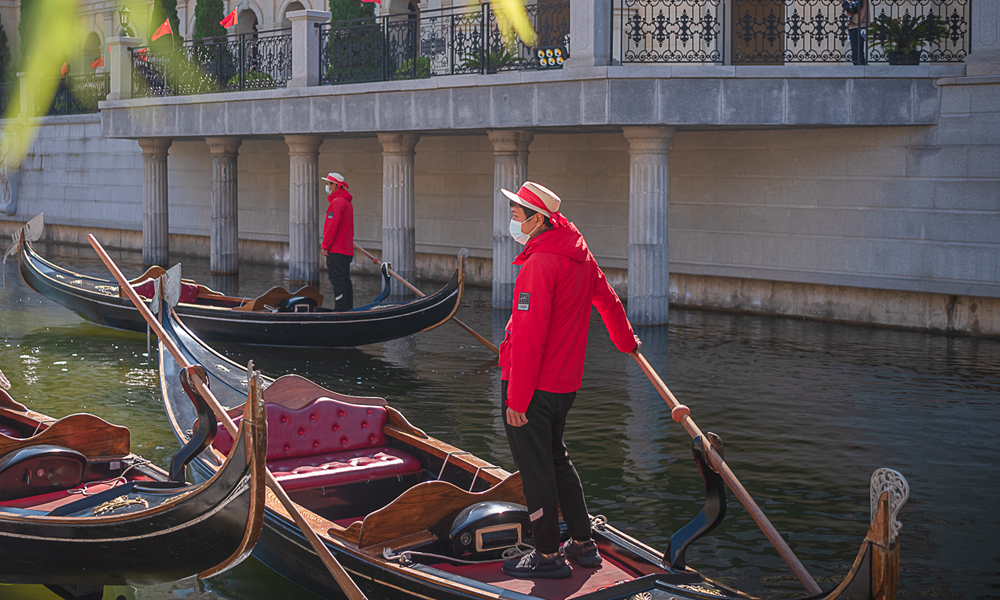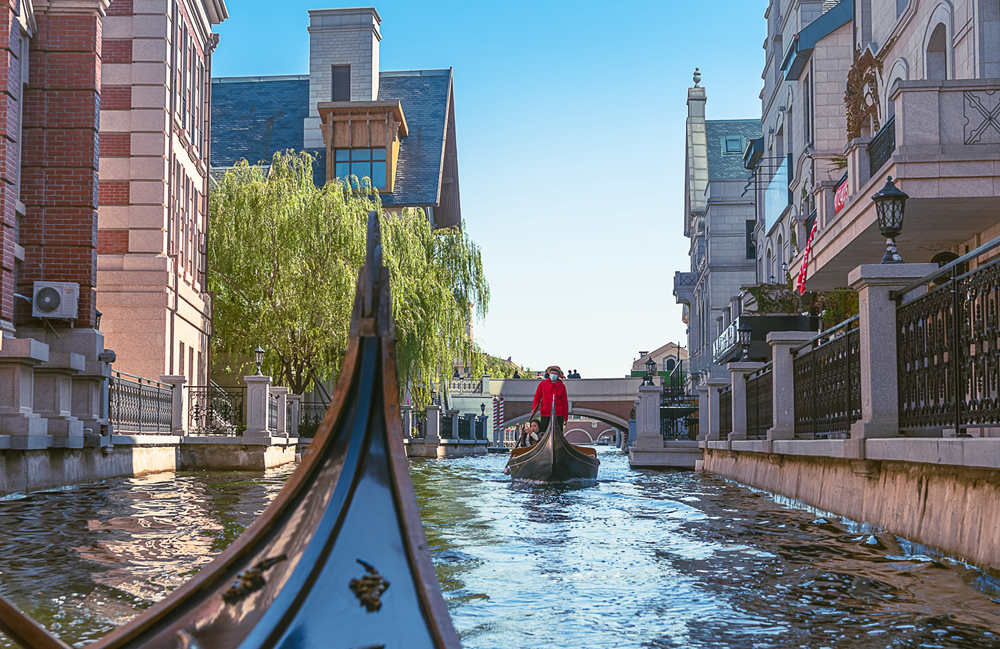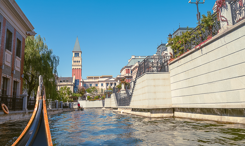 如果说这里是微缩版的水城威尼斯,显然不是很合适,因为首先这里又很大,其次,这里也不单仅仅是威尼斯风格的、依海岸线而建的海昌东方水城内有成排的欧式建筑,人工河道又穿梭于建筑之间长达4公里。而最惬意不过就是乘坐极具威尼斯特色的水上观光出租车“贡多拉”来船览水城风光。沿途两岸异域风情满满,给人置身于异国风韵意味十足!