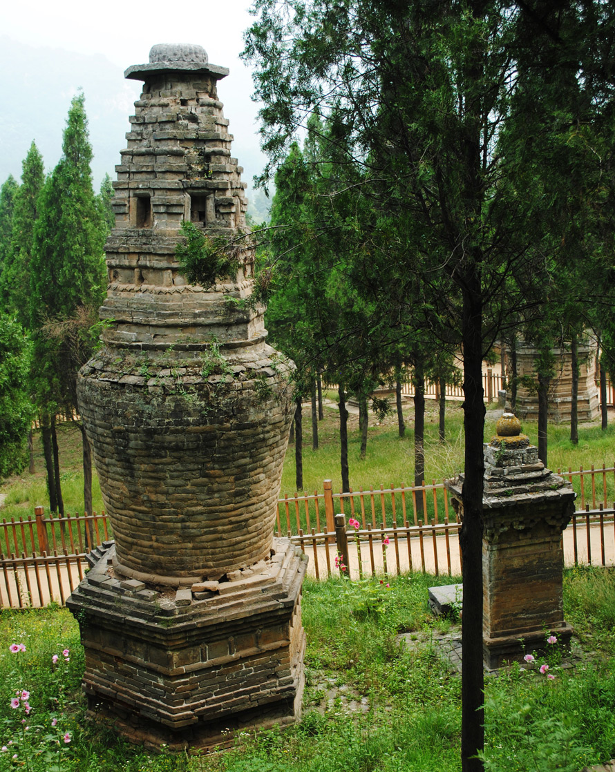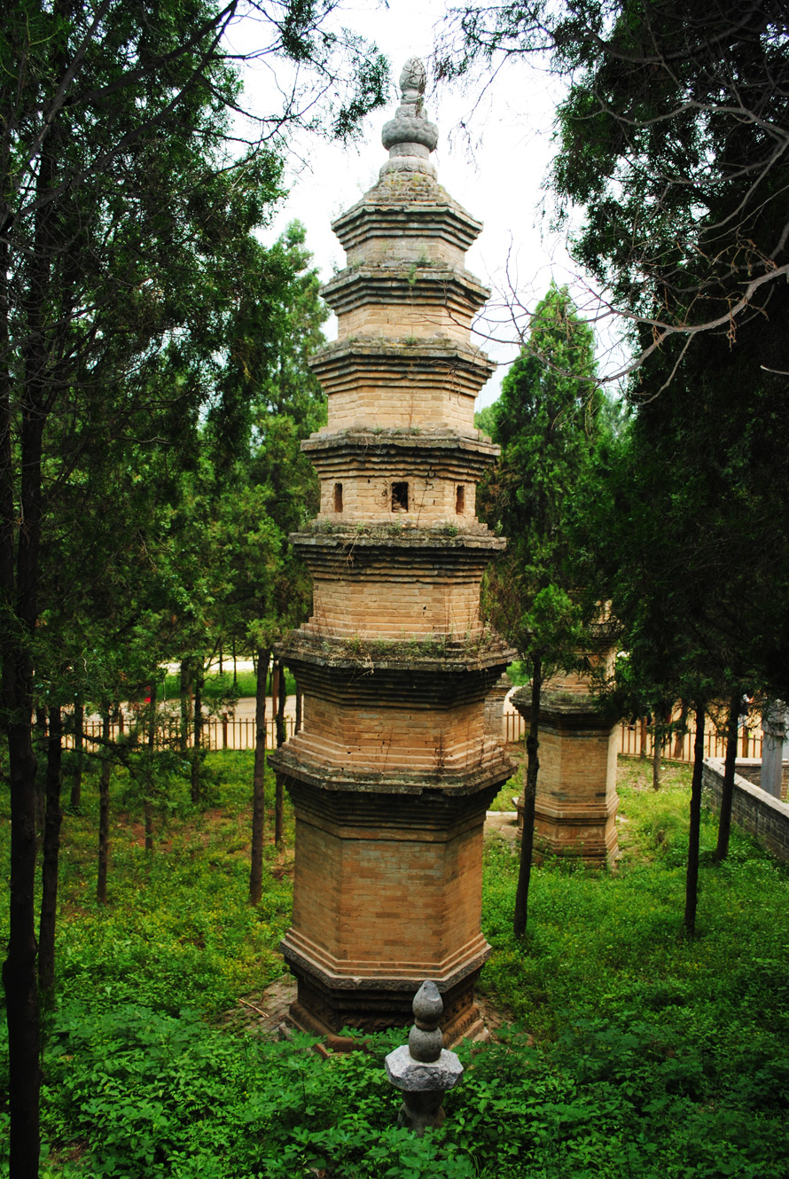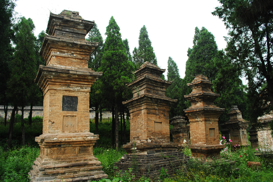 塔林中“年长”的唐代塔有1000多岁,“年轻”的清代塔也有100多岁,都到了风烛残年的地步。还有有不少座古塔微微倾斜或严重倾斜,或许是不堪时光的重负吧。在塔林西北部,一座唐代“法玩禅师塔”倾斜较为严重,它也是塔林中有年代可考的最古老的一座砖塔。法玩禅师塔建于唐贞元七年,也就是791年,是一座方形单层单檐式砖塔,高8米。除塔门、塔刹和塔铭用青石雕成外,通体全都是用水磨砖砌造而成,塔门用高浮雕的手法装饰着飞天、嫔伽等古典图案。