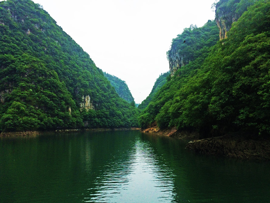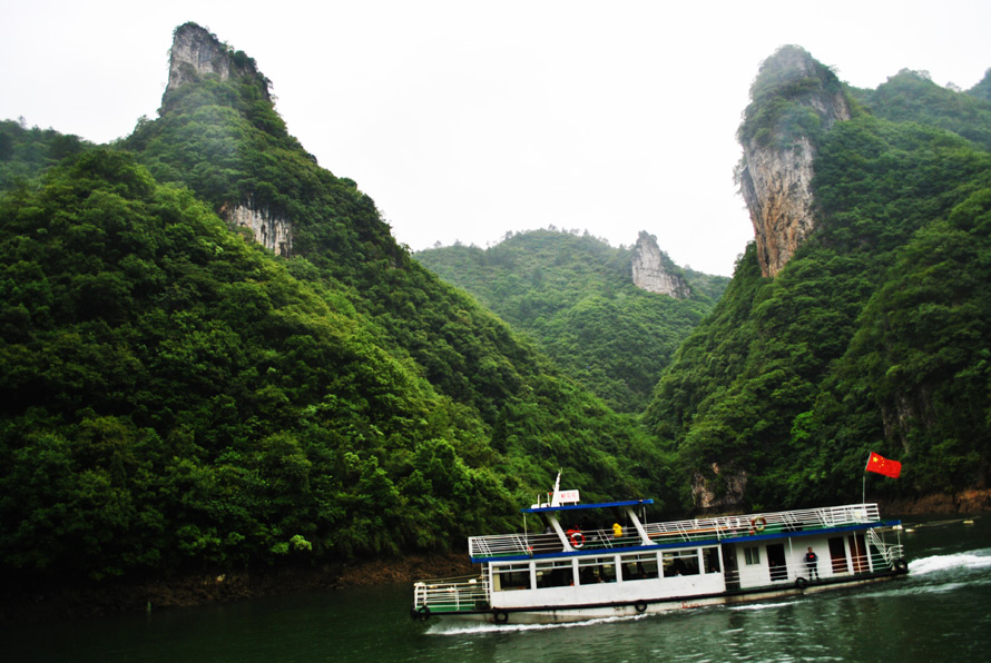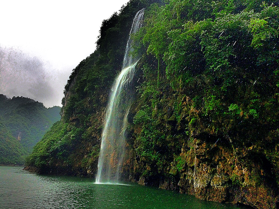 当游船闯过险滩后,便进入风平浪諍的深潭。远山如黛,云雾缭绕,近处一泓水影,呈现蓝天、青山。游船行至“鸳鸯河谷”,景色格外清丽宜人,这里山夹水,水隔山,山水交融,绚丽多彩。剑峰万刃的陡崖上,一挂“飞瀑”,银光闪闪,奔泻河面,发出“轰隆隆”的响声,溅起簇簇飞扬的水花。