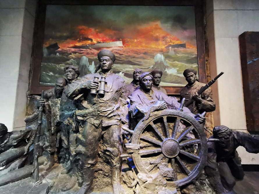曾经在东村附近,打捞上了定远舰的残骸。如今在不远处,我们能够看到1比1复制版的定远舰。定远舰全长94.5米,排水量可达7000多吨,是当时亚洲第一大铁甲舰,也是北洋海军的旗舰。作为对那场惨烈耻辱战争的纪念,以及对那个积贫积弱年代的警示,激励着中国人铭记历史奋发自强。