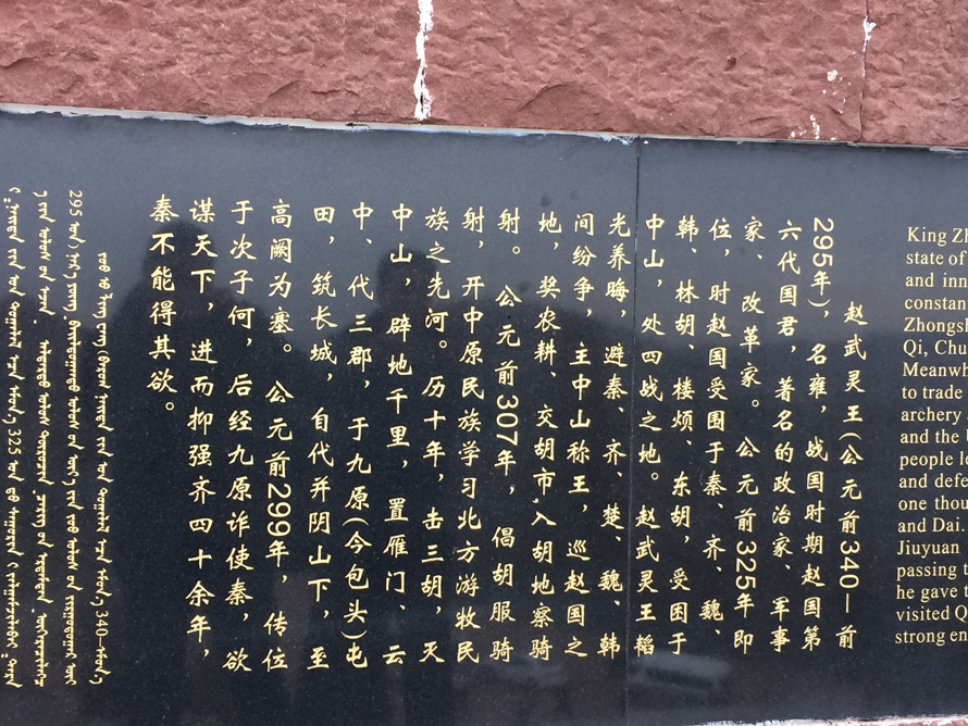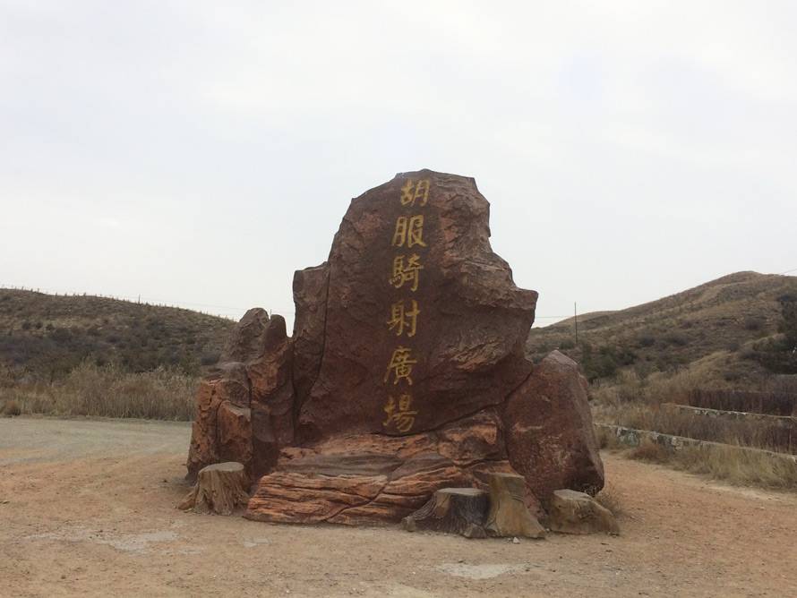 赵长城遗址广场上有一尊武灵王骑马的雕像,他手挽弓箭,骏马奔驰的形象再现了彼时保家卫国的威武气概。广场北侧,赵长城遗址蜿蜒东西,穿行沟谷,展示着历史的沧桑。旁边一块石碑记载了两千多年前赵长城和胡服骑射的历史。“修筑长城与‘变俗胡服、习骑术’,武灵王既有战略上的长远目的,也有战术上的整体提升,是战略战术上一种积极有效的统一……”这是后世对他的评价。