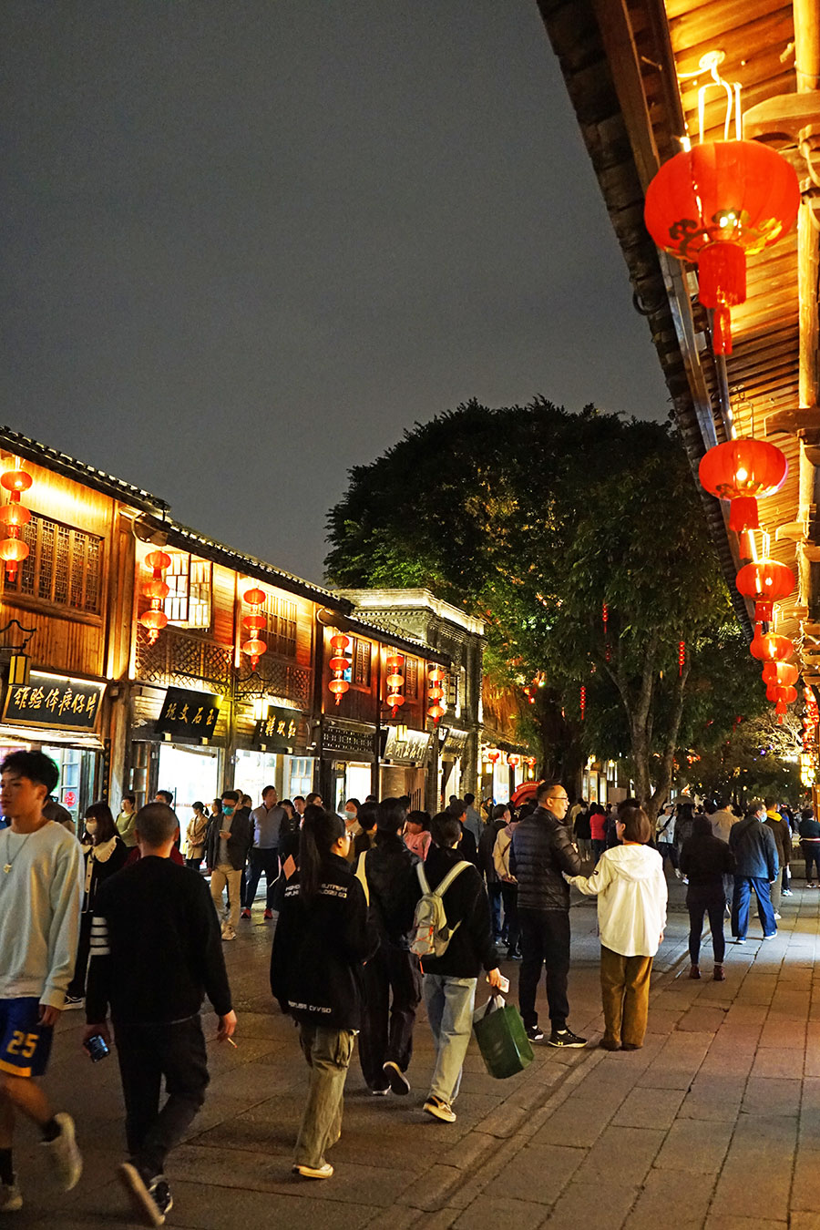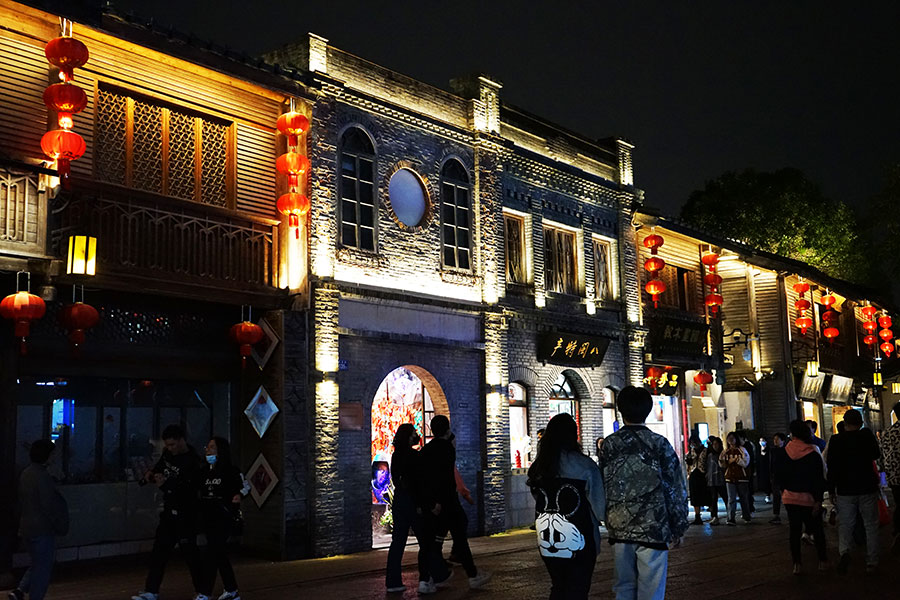 一砖一瓦皆时光,每一个坊巷都藏着一段历史的故事,随便置身一处庭院,赏花厅内的夜色,柔柔的,像微醺的酒,游人一瞅,便忘却归去,古色古香的建筑、小巷子里的故居、红灯笼……不时有黄包车经过,别有一番意境。缥缈的烟雾围绕在戏台周围,轻轻芳草、幽幽花香,地下涌泉的水池倒映着绝美的月色,让人如临仙境,路边偶有弹唱表演,还有捏泥人、吹糖人……三三两两的人群在温暖的灯光中散步,月亮也在坊巷中记录惬意。