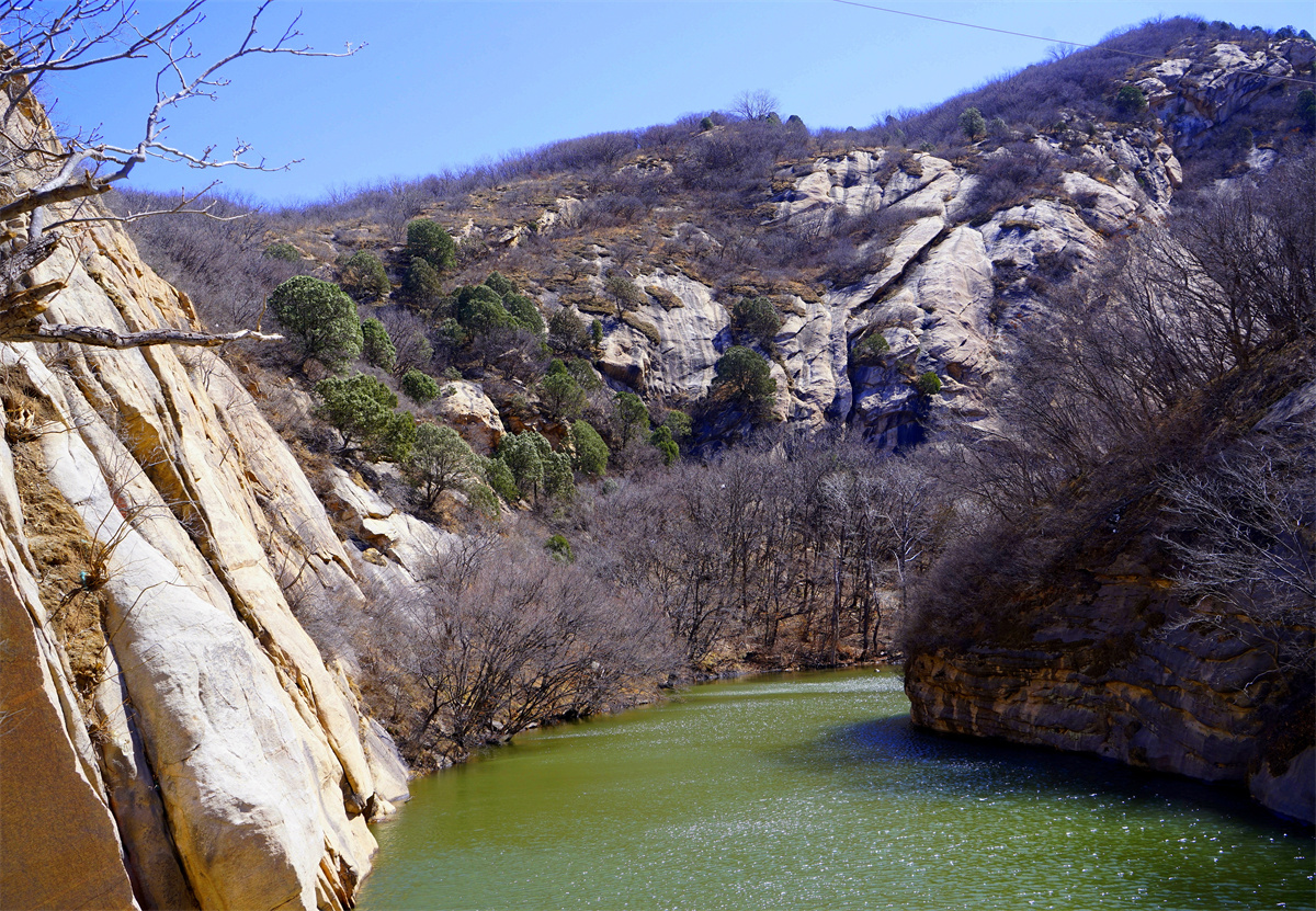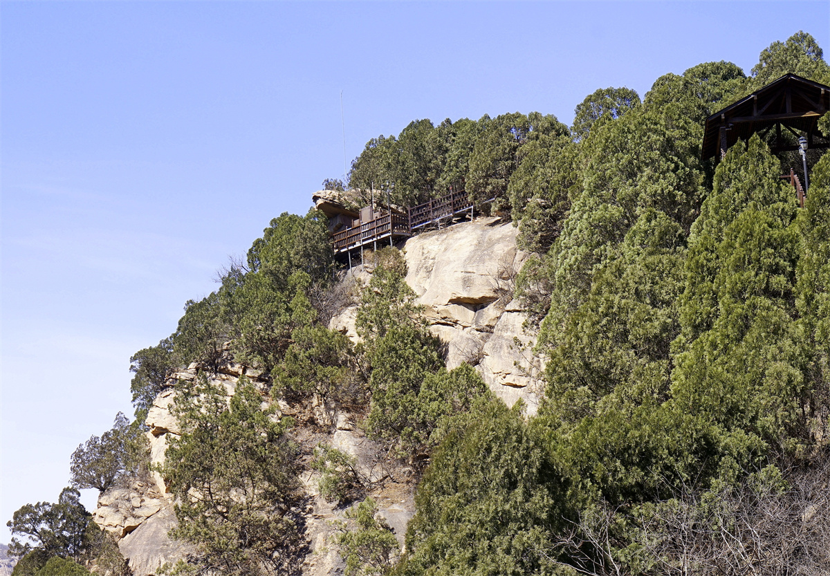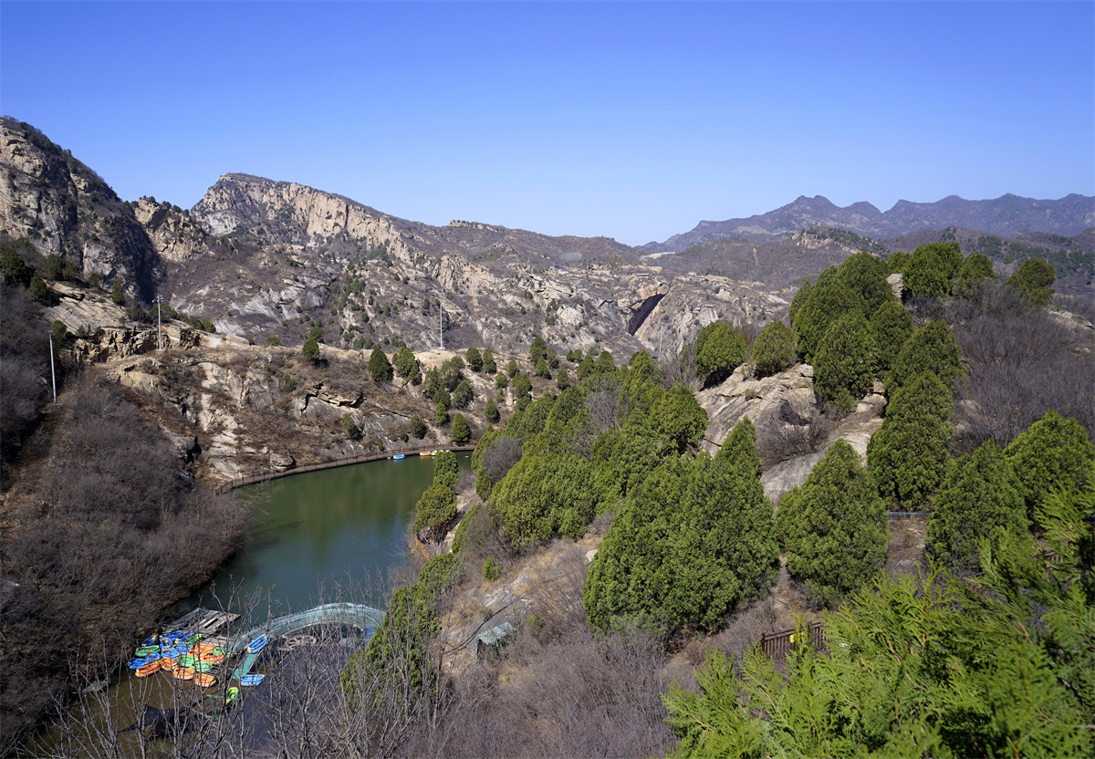 景区中的变质核杂岩地质地貌使得连绵起伏的群山成为看点,站在玻璃天桥两端看群山,你会感受到生长在悬崖峭壁上树木花草的勃勃生机,你会发现在这里不仅有形似龙头下探春水,你还会发现形似乌龟昂首远眺的两块巨石。