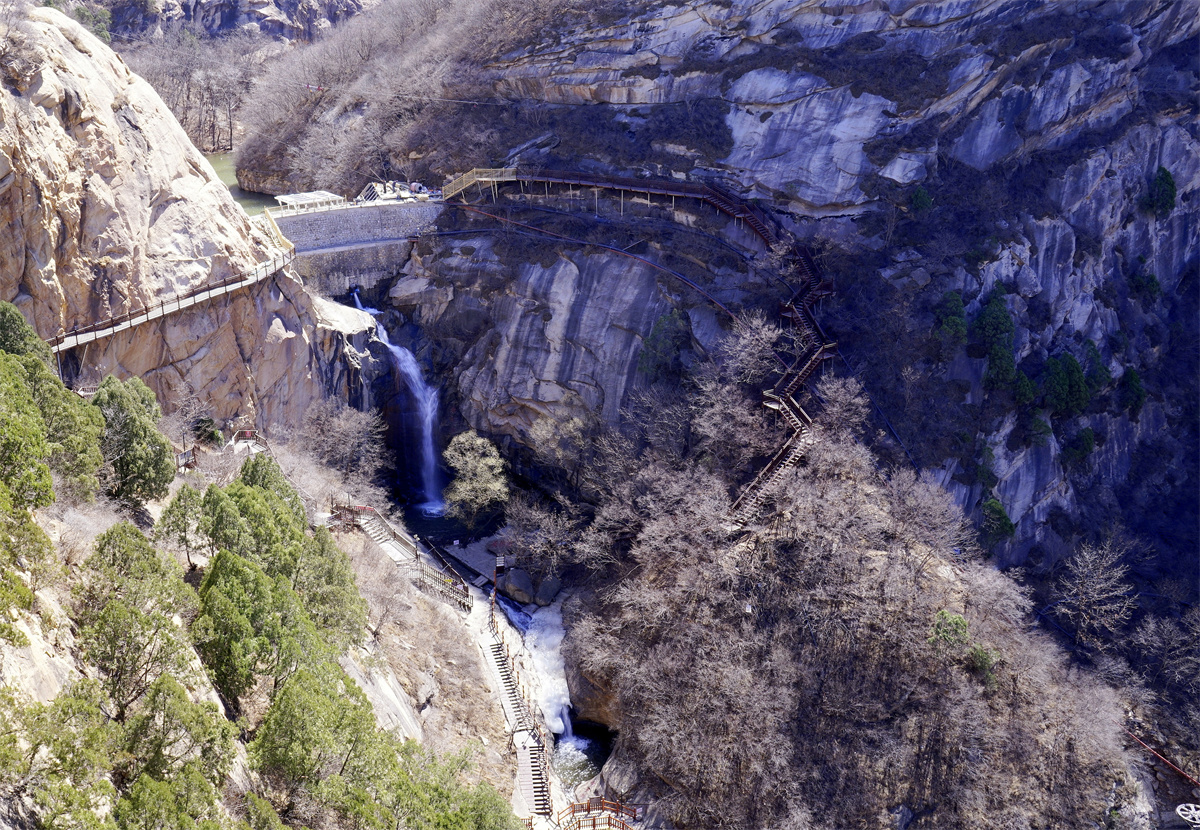 亮点三,在景区乐仙瀑上方修建了木栈道,游客可以登上山顶,一览绿色平湖,也可作为观景平台,拍摄山水之美。
