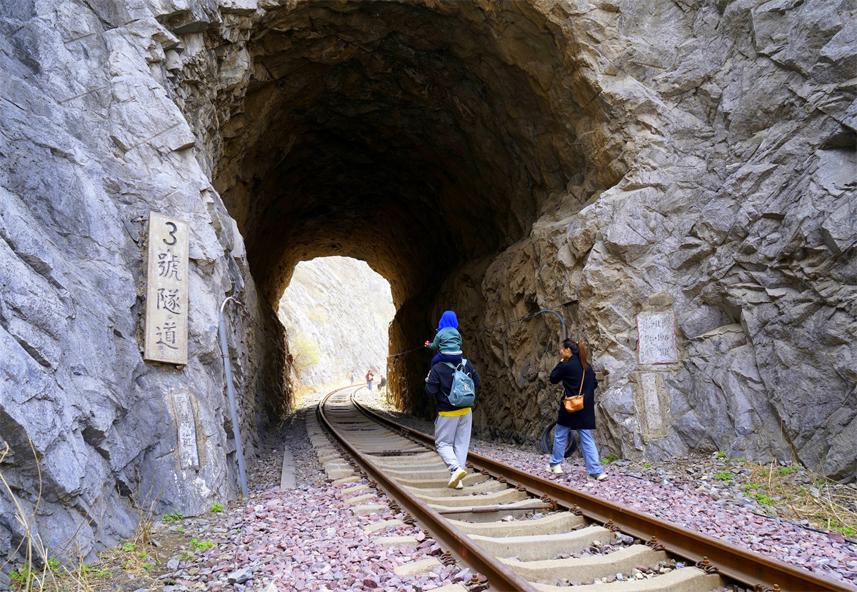 从野溪站出发,沿着铁轨分别穿过1、2、3号隧道,沿途看见不少带孩子出行的家庭游,扳道岔,幽深漆黑的隧道,激起孩子们的好奇心。他们在山野中,循着这条路,听爸爸妈妈讲述过去的故事;他们张开双臂,行走在一条条枕木上,脑海中似乎幻化出呼啸而过的列车。
