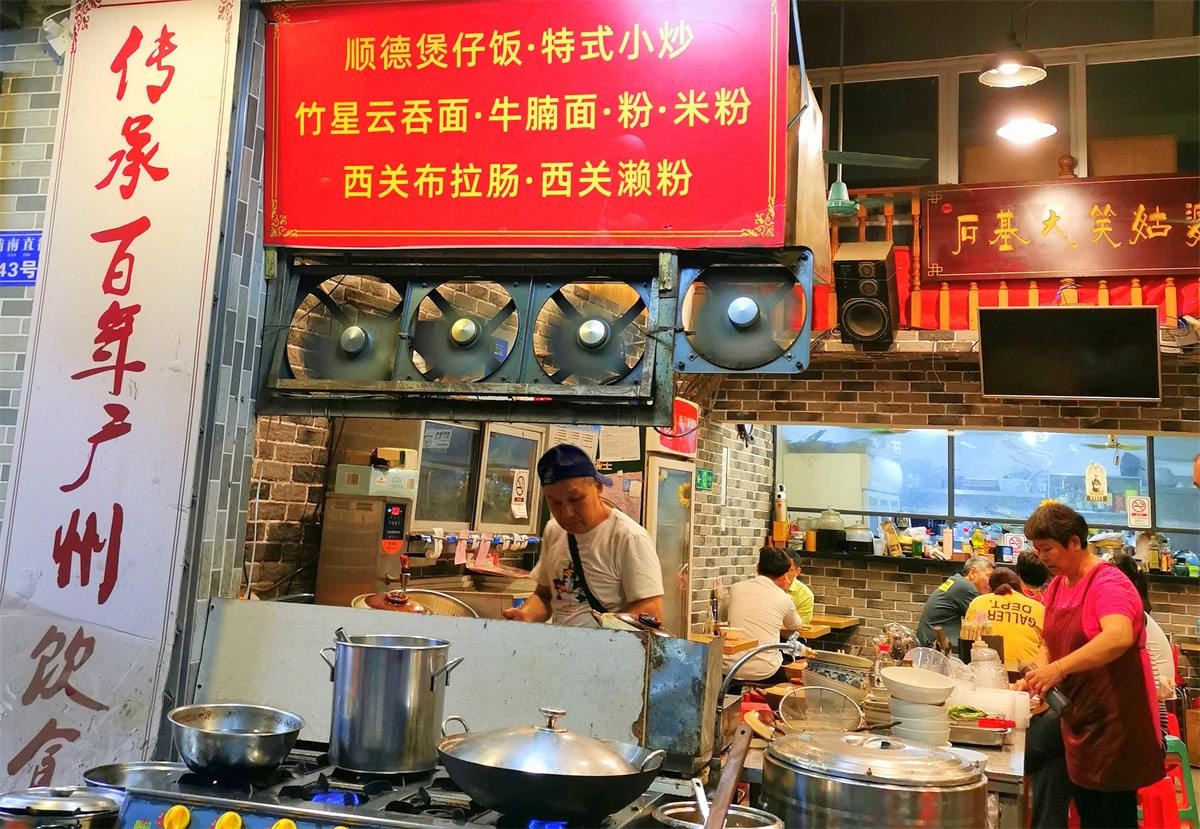 距离古港码头不远,有一条特色美食街,各式各样的地方美食店里坐满了避雨、就餐的游客。我们在一家名为“石基大笑姑婆”的店里品尝顺德煲仔饭。招牌排骨和鱼腩肉饼饭,煮熟的大米饭放在砂锅里,配上肉、菜或肉饼,锅巴的焦香味很浓,锅中的色彩也很好看。鲜肉云吞面、虫草花瘦肉、油菜等也是各具特色。面条与馄饨融合为一体,虫草花叶子散发着淡淡的苦味,大叶的散生菜用水焯过,拌上调料,就是广州人称之的油菜。品完美食,逛过黄埔古港码头,走到古村落口。由于雨势较大,我们只得选择乘坐出租车匆匆绕村一周,浏览了这座因古代传说凤凰曾光顾而得名“凤埔”的古村院落,感受着时光岁月中残留的历史沧桑。
