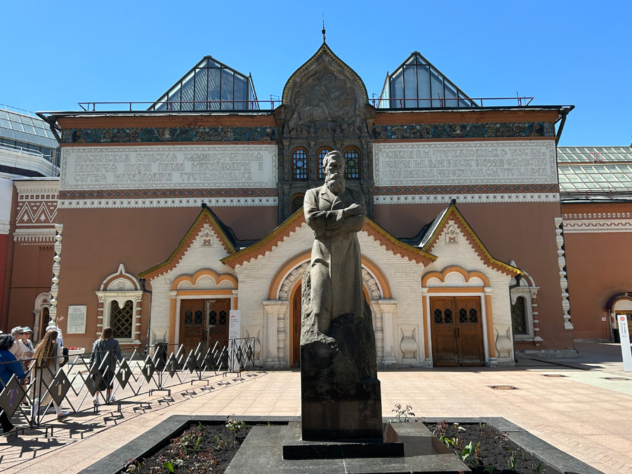 从莫斯科河边进入拉夫鲁申斯基巷北行,大约20分钟的样子,便可看到一座有着鲜明的19世纪俄国建筑风格的建筑,这就是画廊主馆,大门上方装饰着莫斯科的旧城徽,门前的庭院里是特列季亚科夫的雕像。