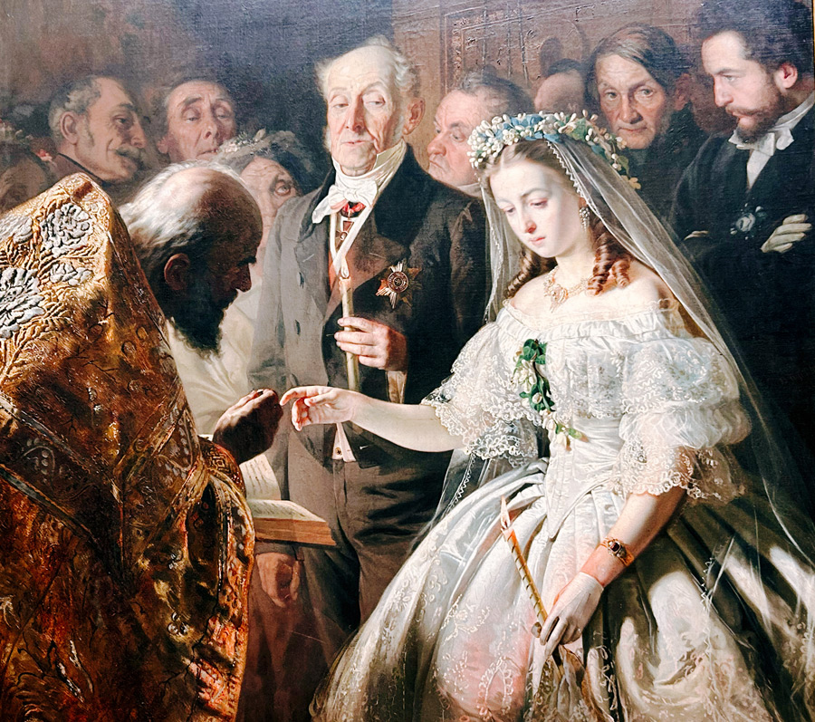在编号为16的展厅里,还有一幅画叫《不平等的婚姻》的画作,一个看起来年纪很小的白皙少女身着婚纱,欲牵手一个风烛残年老得不像样子的男人。看介绍,这幅画反映的是19世纪中叶,当时俄国的女孩子和妇女毫无地位,违背自己的意愿被迫出嫁。这种现象无疑是当时社会的一种病态。但奇怪的是,作者也将自己画进了参加婚礼的宾客中——站在新娘身后双手抱在胸前的男子。