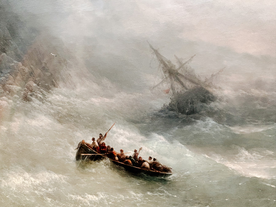 另一处展厅墙壁上,一艘轮船在滔天的巨浪里几近淹没,人们在海浪里挣扎,画作色彩幽蓝,令人有置身巨浪的质感,不由得为画作里的人物命运感到担忧。