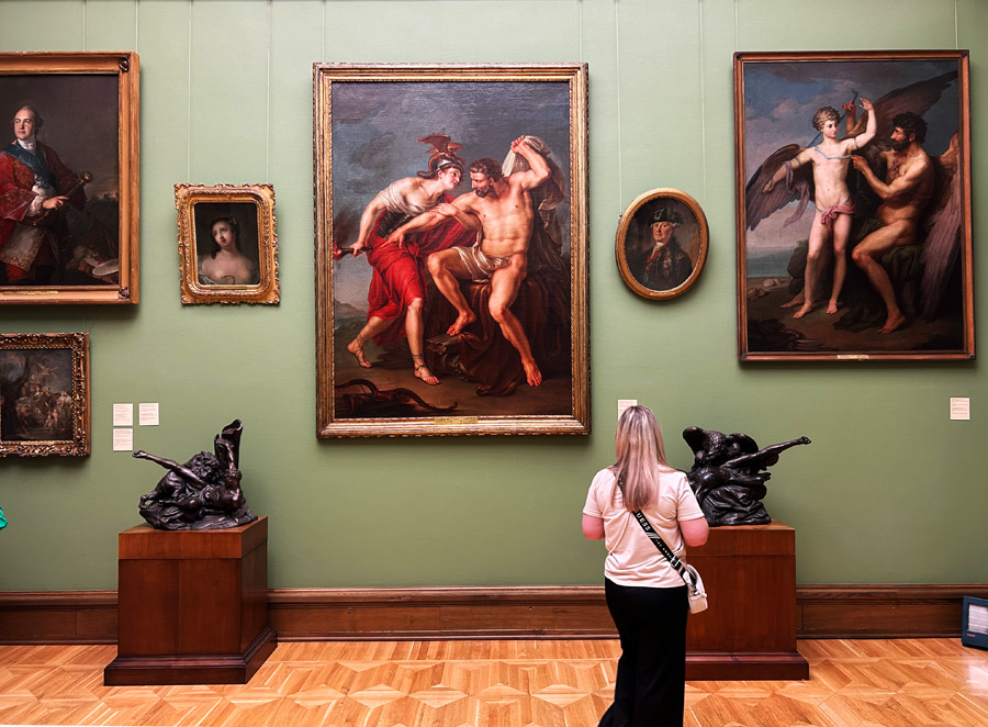 作为游客,我们或许不能看懂画家的技法与思想,但能够通过画作看到历史的场景,感受到作品表达的意象就足够了。绘画作为一种艺术形式,总是与其所处的时代和社会文化背景紧密相连,也是对现实世界的描绘和对人性的探索,从而引发人们对美好事物、对善良正义、对历史真相的思考和追求。