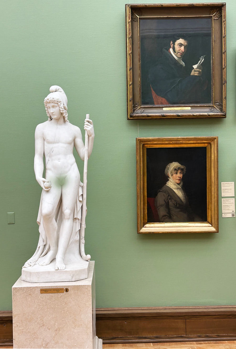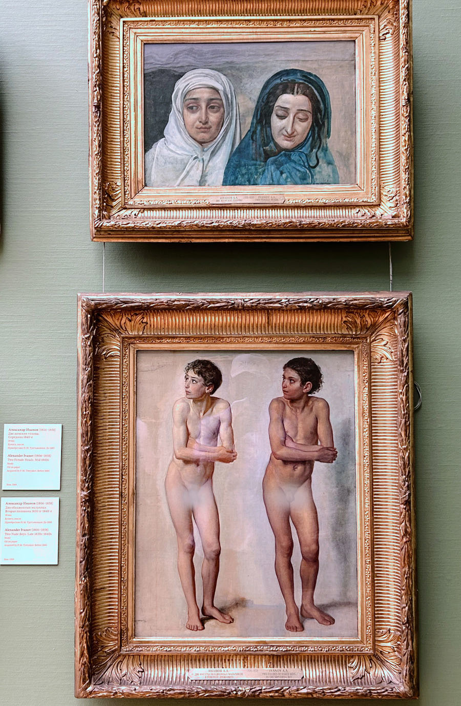 我印象最深的要数一个展厅里的一幅画作《基督出现人间》,画面宏大,占据一面墙壁,旁边的牌匾介绍,这幅画的作者是沙俄时期著名画家,皇家艺术研究院院士亚历山大·安德烈耶维奇·伊万诺夫,他画这幅画前后历经了20年的时光,描述的是救世主降临人间,人们第一次见到耶稣的情景,画面似乎不单是在表现宗教故事场景,还在于表现人类的本质及其某种感受。每个人物的神态都趋之若鹜,但表情各不相同,衣服的颜色与人物动作以及裸露的肌肤,甚至人们的裸体丰满或清瘦,还有一个男子的生殖器尽管被遮挡,但依然清晰可辨。