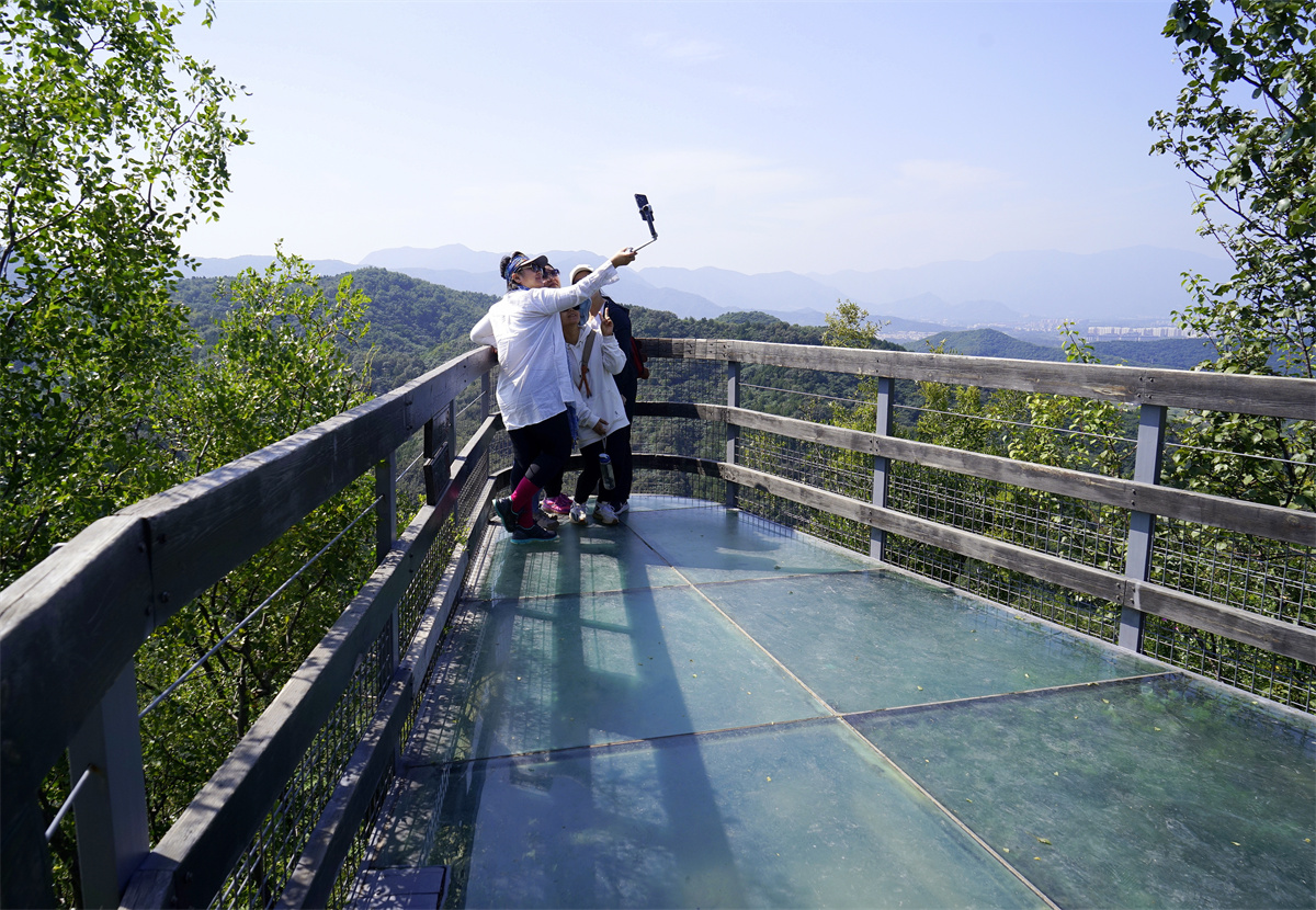 园区内能看到不少喜欢爬山的游客,山地空气清新,花草树木繁多,漫步在山林间,心情格外放松。无障碍公路非常适合中老年人以及带小孩的家庭,沿路看到不少老年人带着登山杖轻松地爬山。