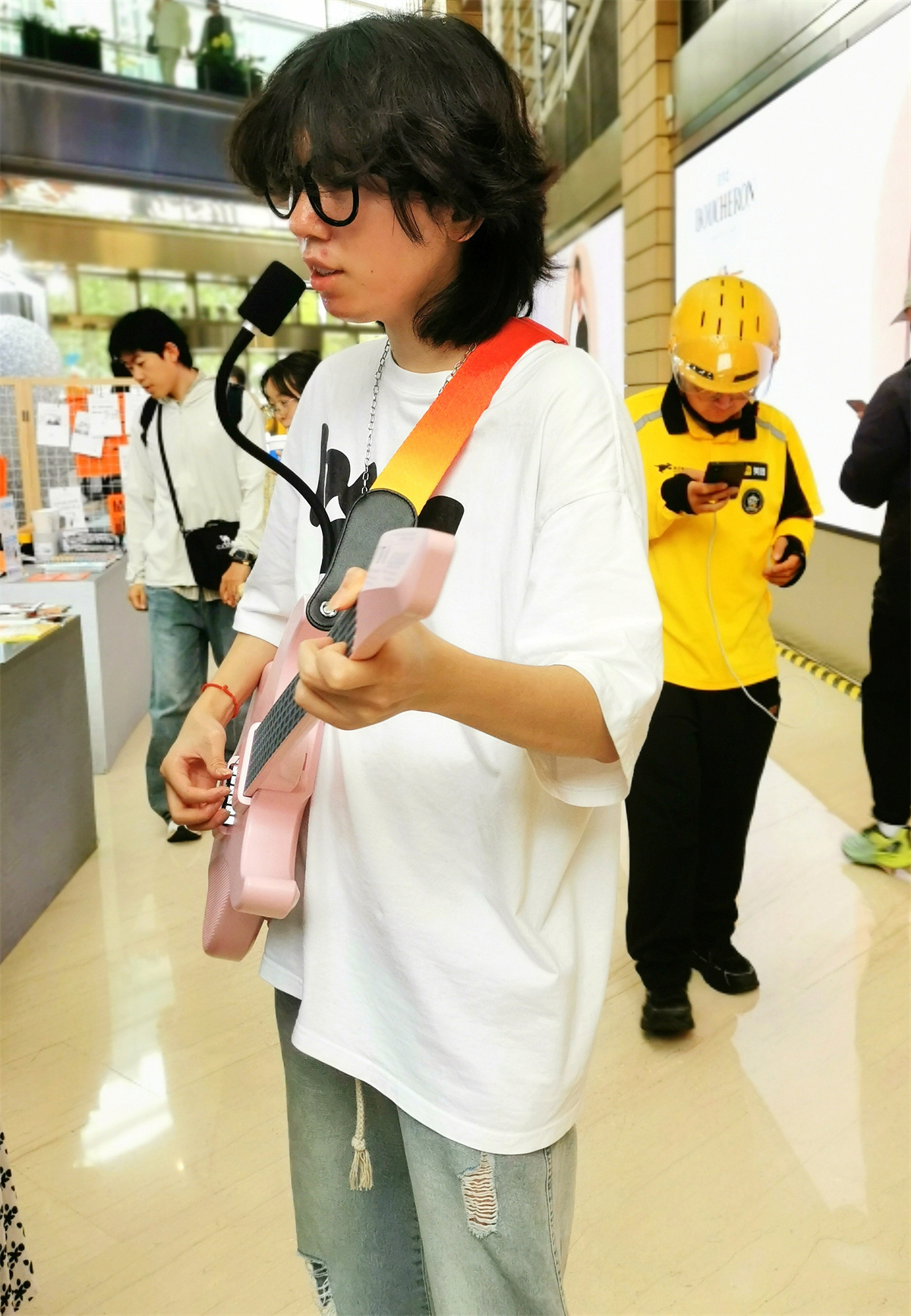 不远处,悦耳的吉他声吸引着过往人群。两位吉他爱好者指尖轻拨琴弦,天籁之音如流水般流淌。这款“空气乐队吉他”,用科技为人们带来了高品质的音乐享受。