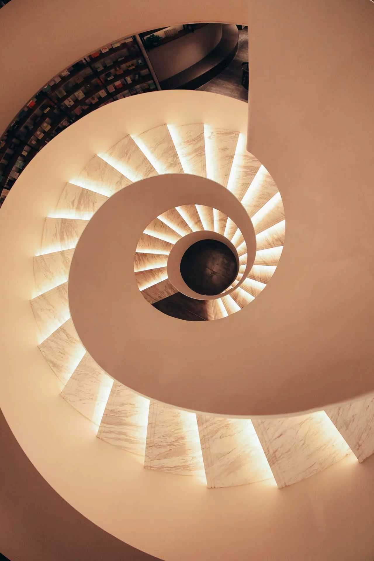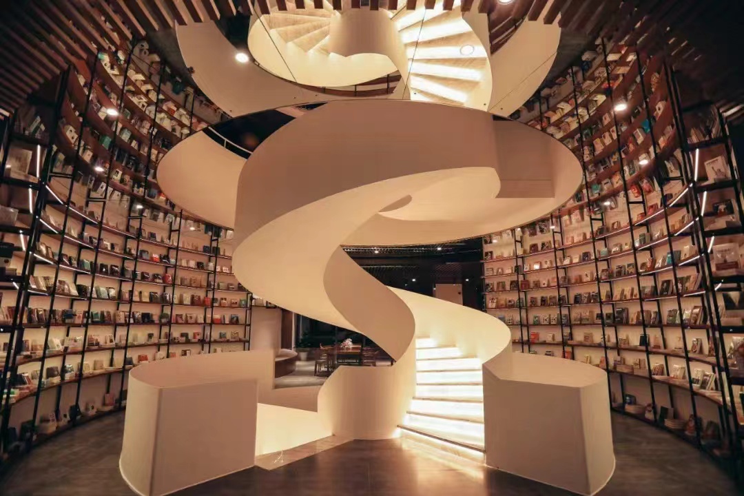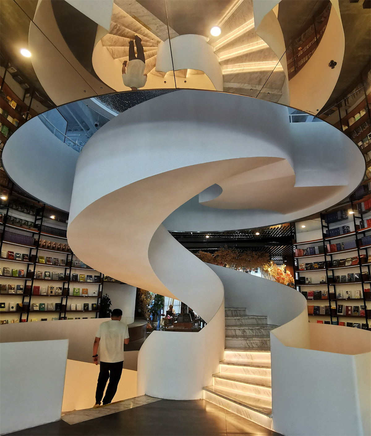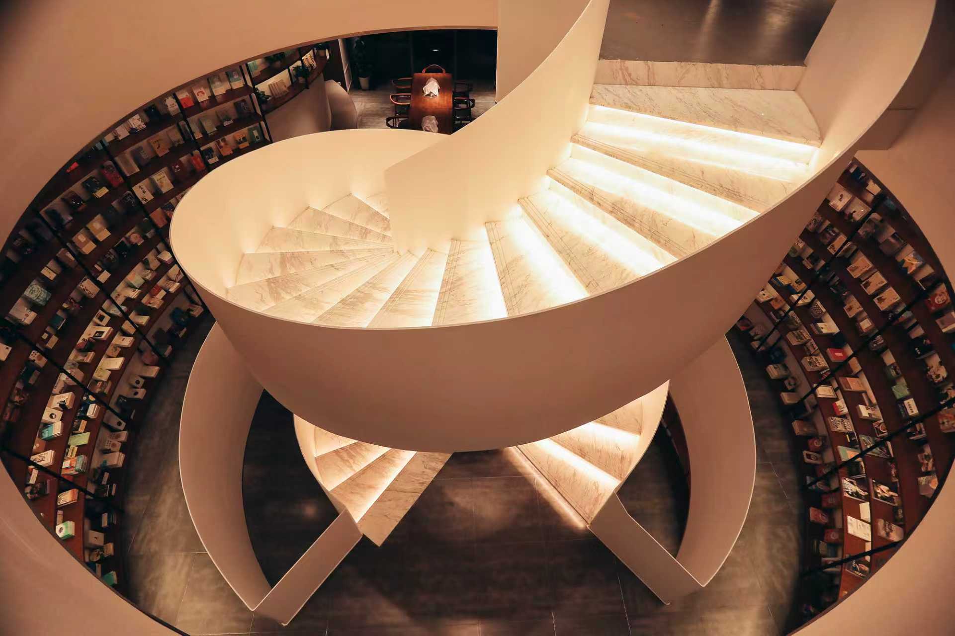 走进憙阅堂,一座巨型旋转楼梯率先映入眼帘。站在不同角度凝视,能收获截然不同的视觉体验:从正面看,它像一盏顶天立地的花灯,明暗光影搭配得恰到好处;站在高处俯瞰,层层叠叠的形态又似缓缓展开的图书;若再细品,还能联想到福建土楼,只是相比之下,这楼梯更添了几分绚丽色彩。