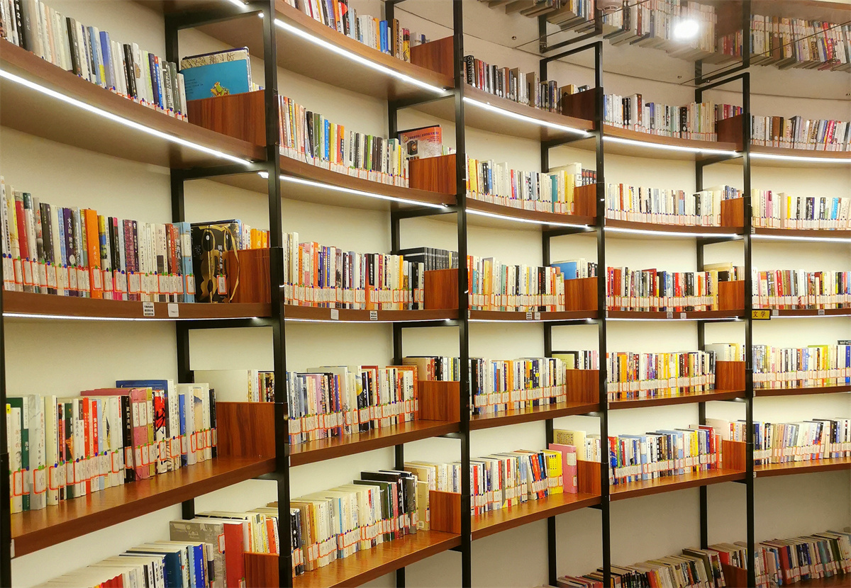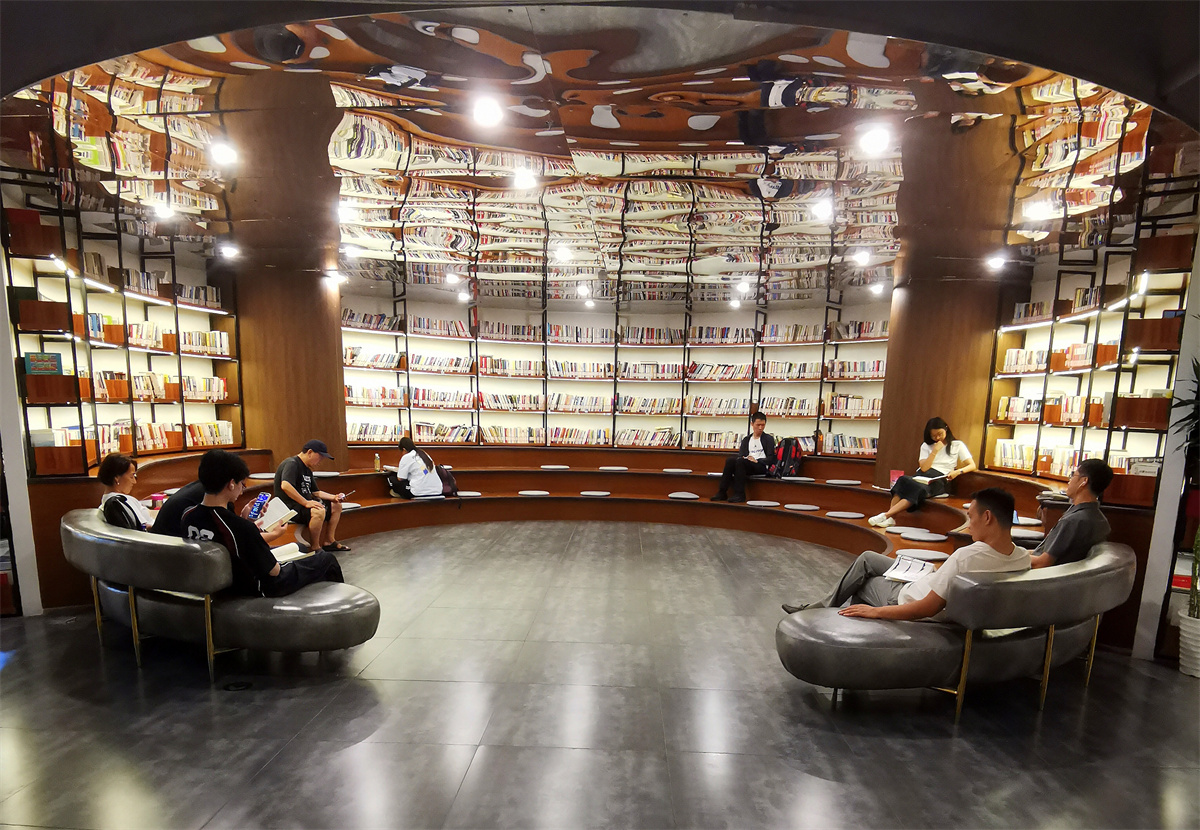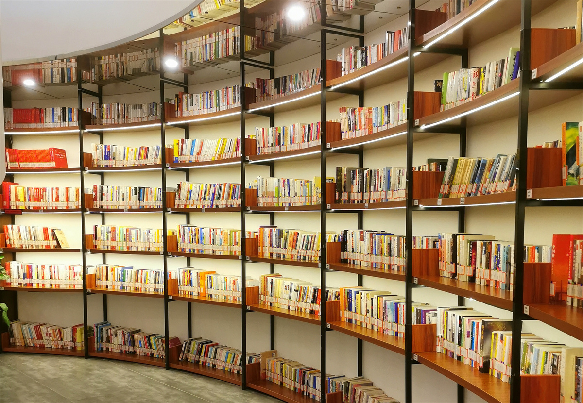 沿着美轮美奂的楼梯下到地下一层,环抱式交流空间既是读者看书的好去处,也是一处满溢浓郁书香的活动场地。环绕楼梯的书架勾勒出优美的弧形线条,带来视觉上的美感。在这里,你可以完成图书借阅,也能徜徉书海,静静感受萦绕周身的书香氛围。