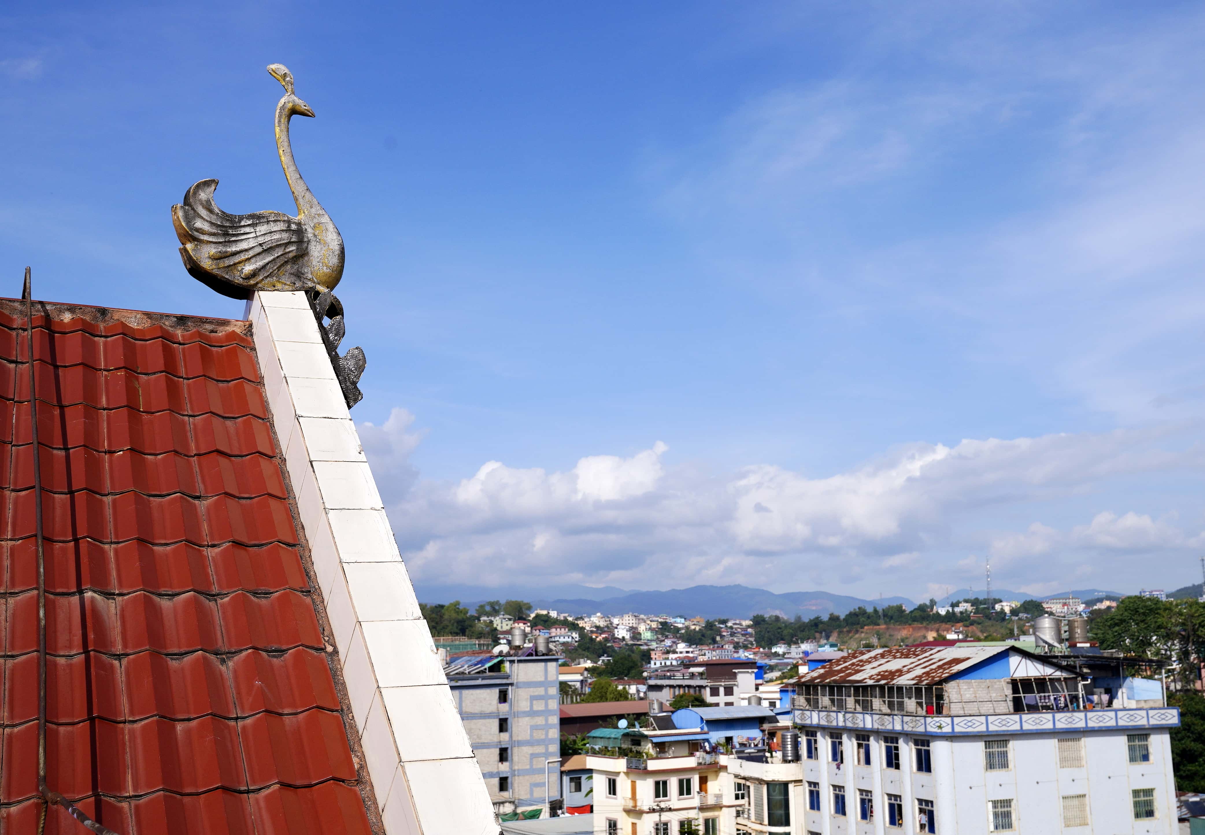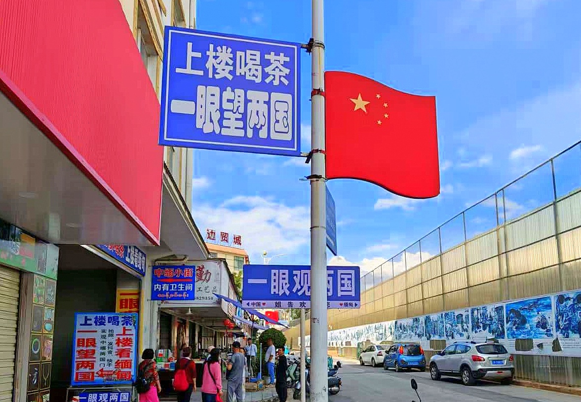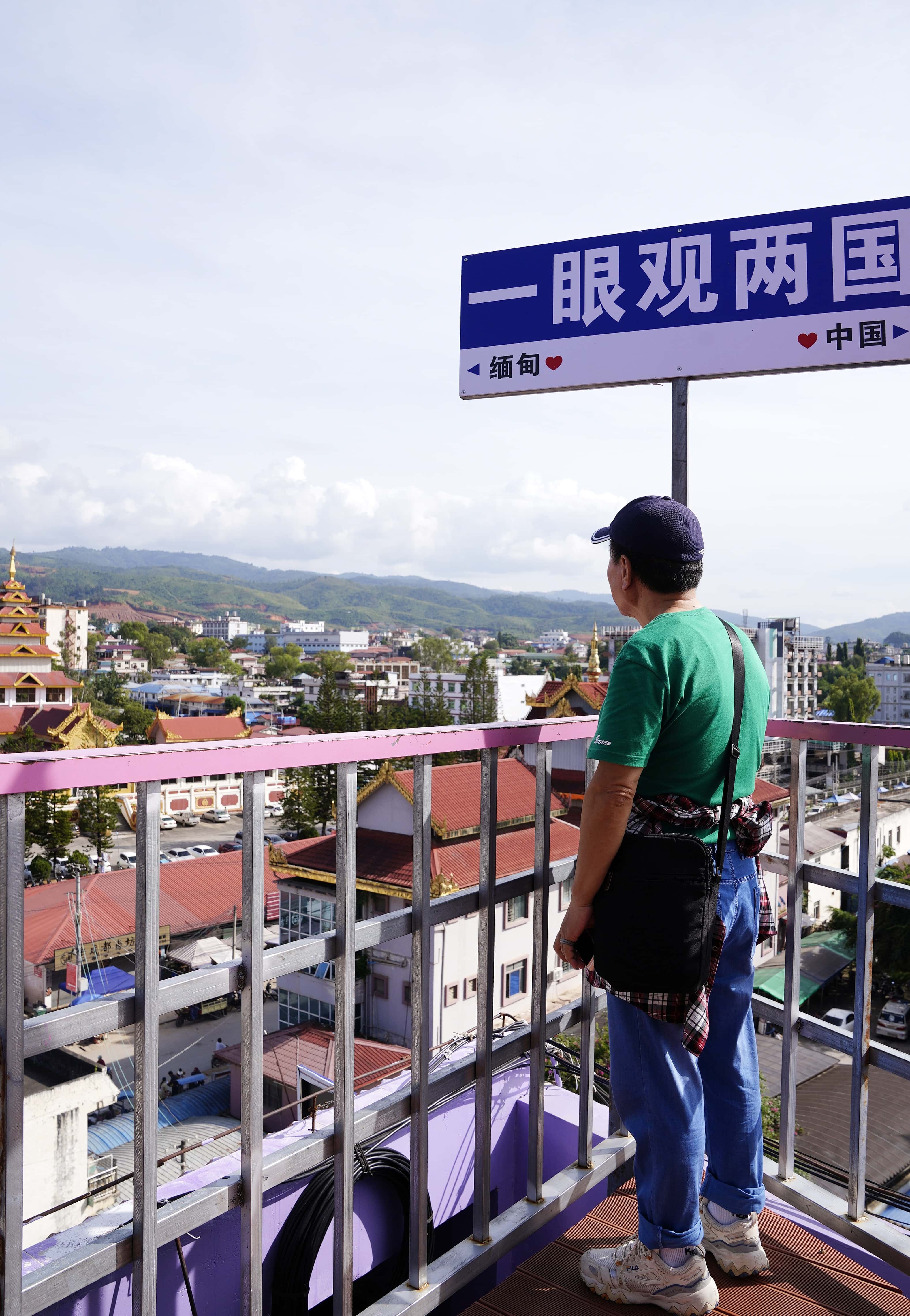 打卡完毕,抬头便能望见旁边建筑楼顶“一眼观两国”的醒目标识牌,这是一处藏在高处的观景天台,也是摄影爱好者的宝藏之地。徒步登上七层高的楼顶,视野瞬间开阔:对面具有浓厚缅甸特色的建筑与田园风光、错落的民居尽收眼底,炊烟袅袅与这边的车水马龙形成奇妙的呼应;低头俯瞰,国门广场上人来人往,若是静下心来,在楼顶的茶桌旁品一杯当地的茶,看两国风光在眼前铺展,时光变得格外舒缓。