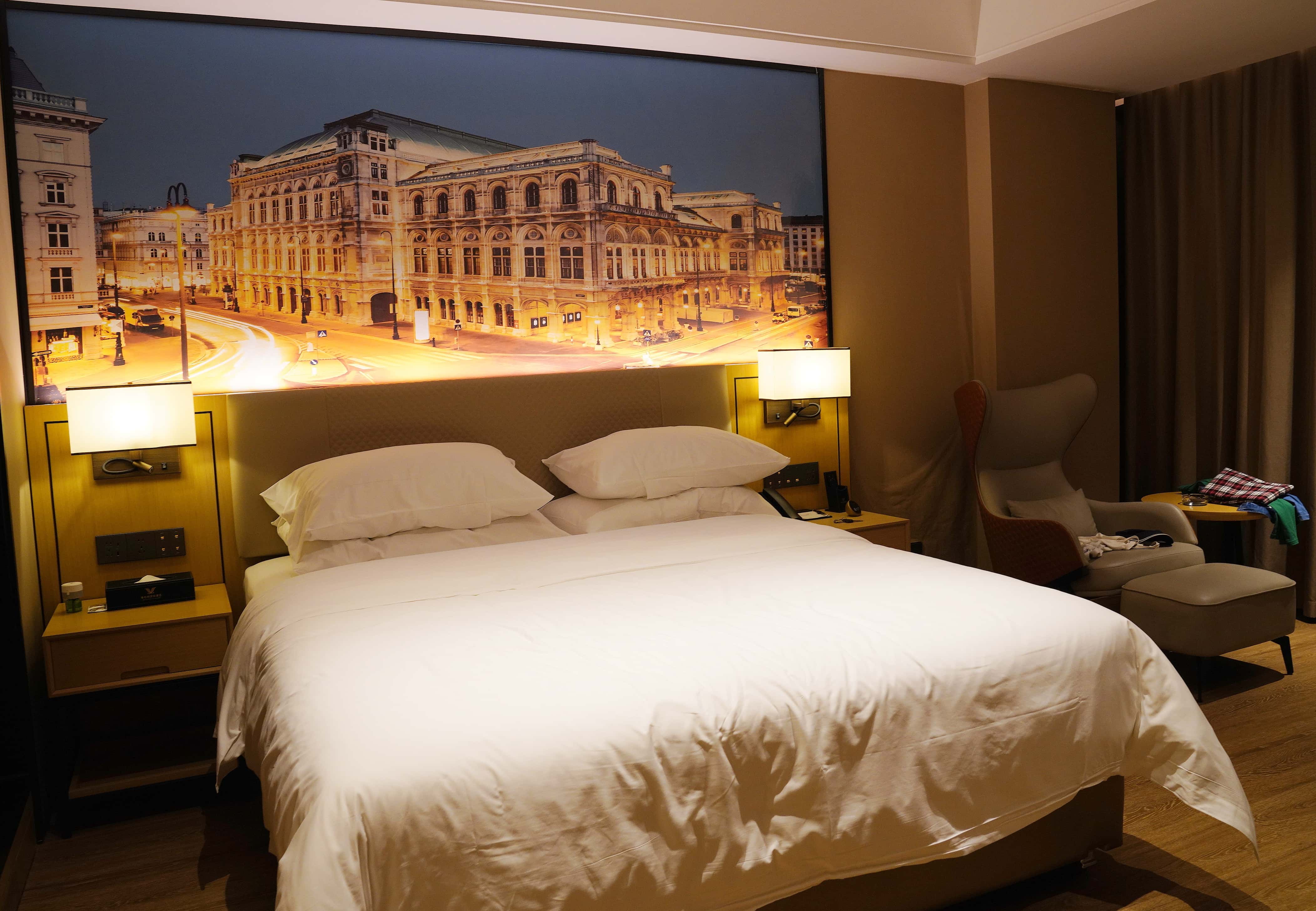 走进房间,智能化体验让人眼前一亮 —— 无论是调节灯光、切换频道,还是查询信息,只需呼唤 “小度” 便能轻松搞定,对带着老人和小孩的家庭出游格外友好。床头悬挂的壁画充满异域风情,色彩浓郁、笔触细腻,恍惚间仿佛穿越到了邻国街巷;圆桌旁的小竹筐更是藏着惊喜,里面整齐摆放着指甲刀、耳塞、暖身贴、牙线等实用小物件,这般细腻贴心的配置,瞬间拉满了好感度。
