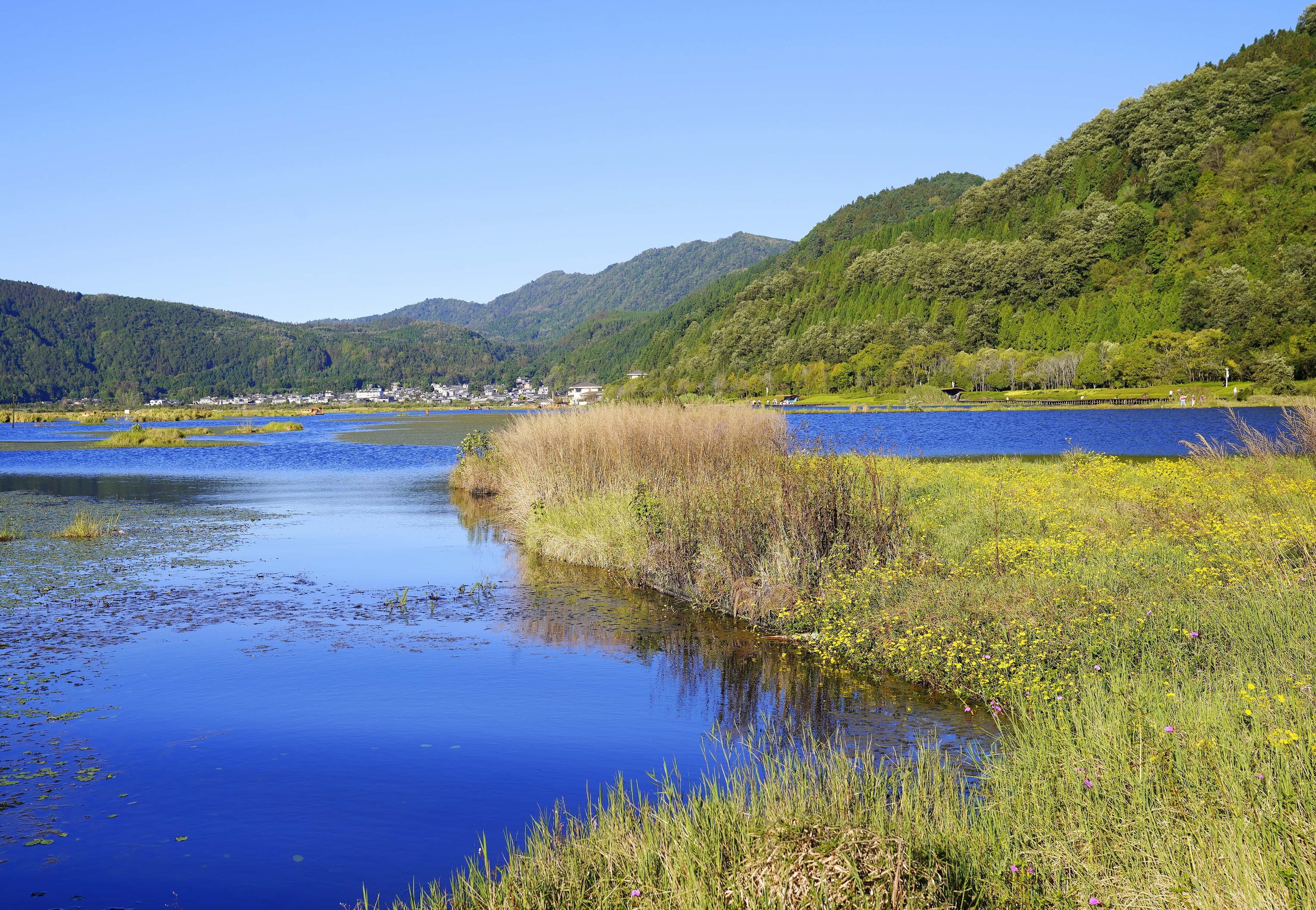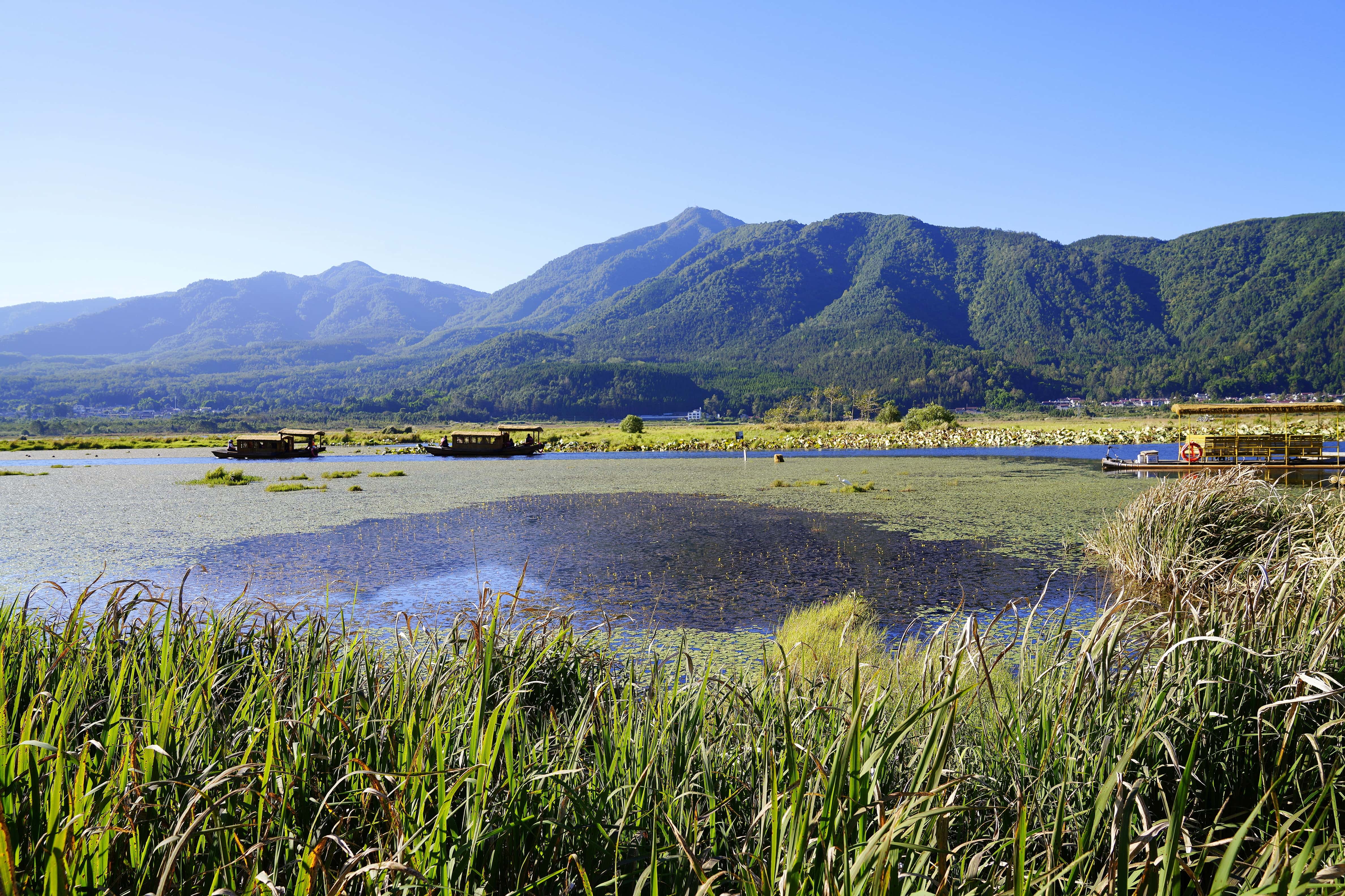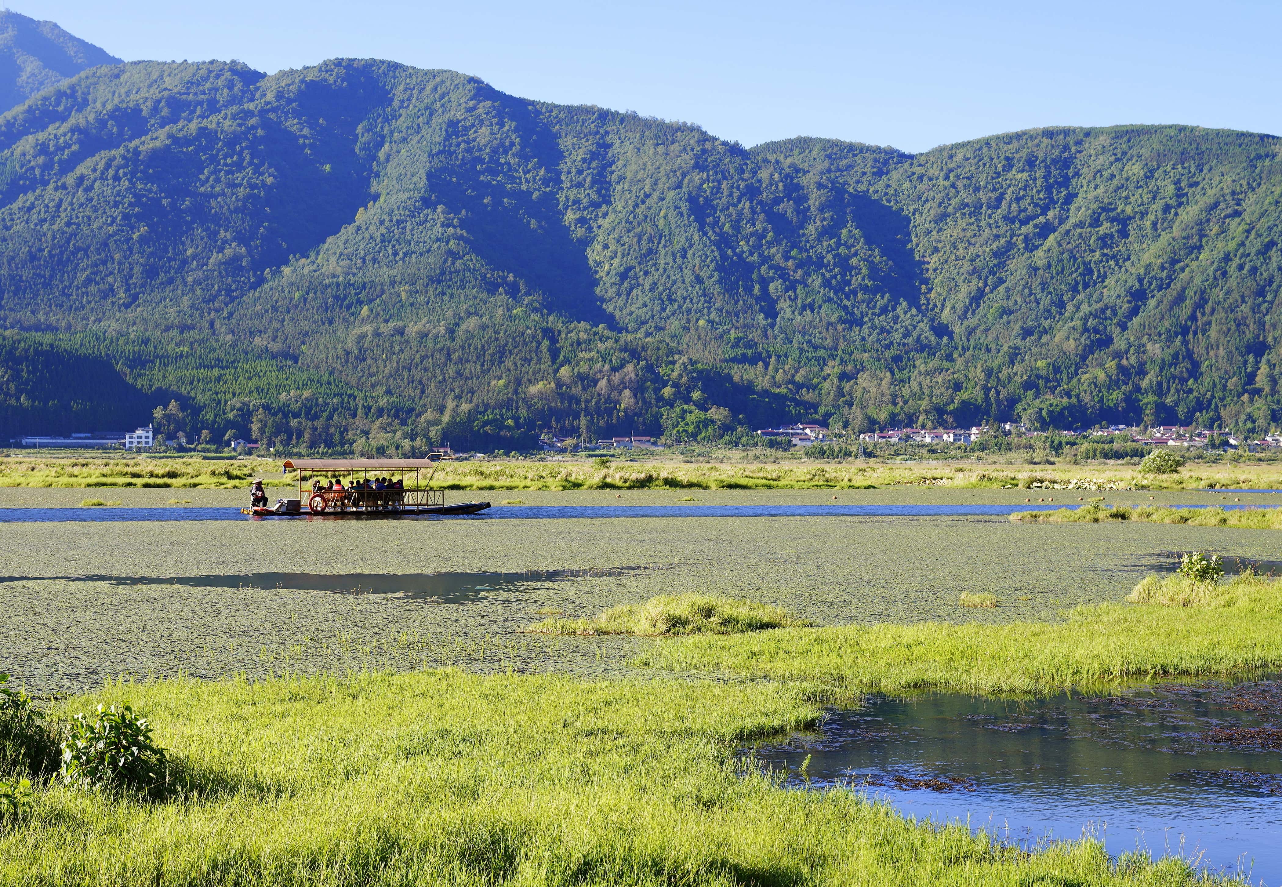 群山环绕的湿地是摄影爱好者的天堂,推荐三处取景地:二、三号渡口岸边,抓拍游船穿梭、罩鱼劳作与草排嬉戏的鲜活场景;水上科普长廊,定格湿地盛景与栖息水禽的自然画卷;二号渡口附近,收录青山映碧水的诗意全景,沿途游客的载歌载舞亦是动人瞬间。