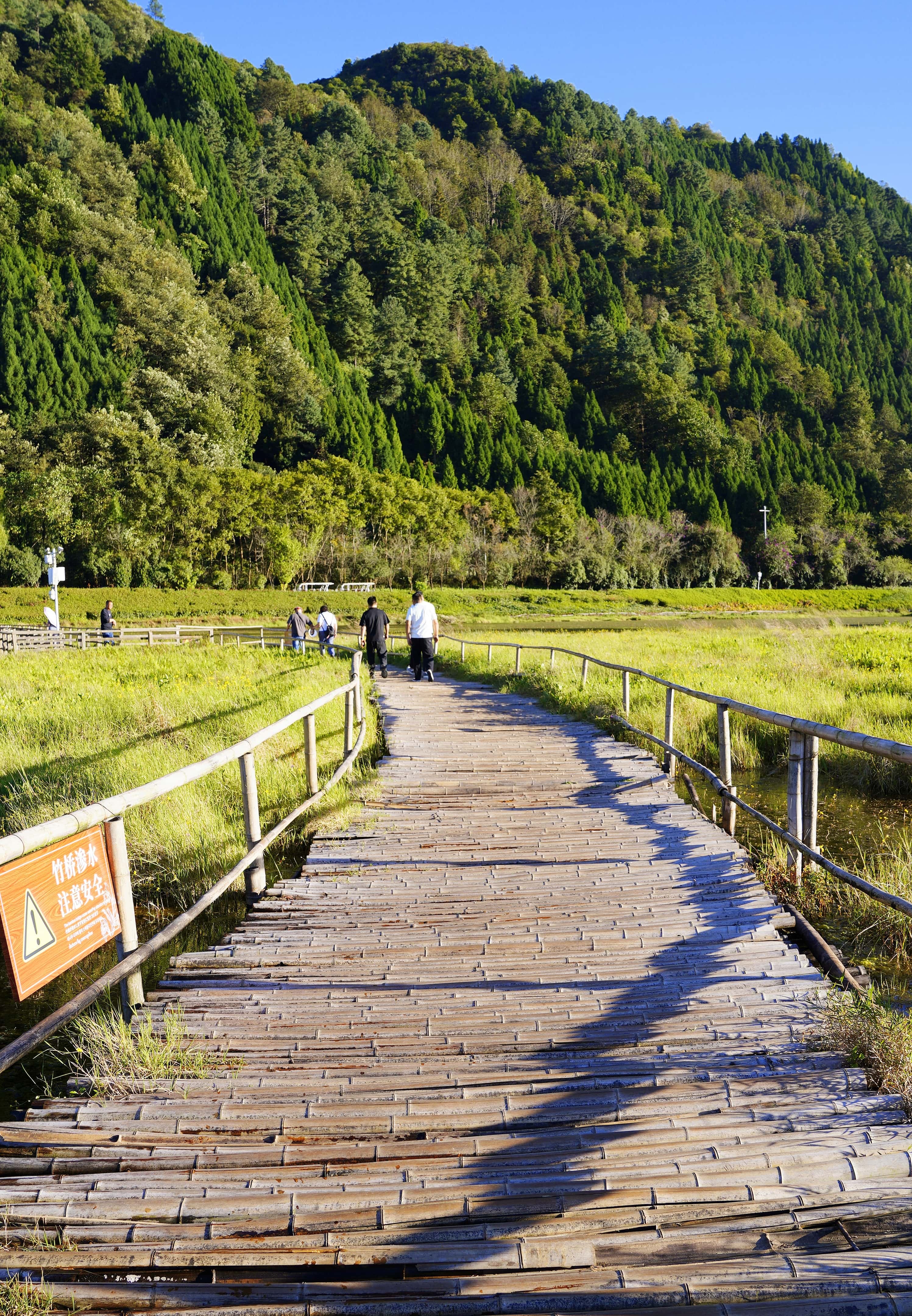 除了赏景,三号渡口的特色项目不容错过。古法罩鱼复刻原著村民的捕鱼智慧;草排体验解锁原生态划水乐趣;还有水上自行车等娱乐项目可供选择。而水上科普长廊的原始竹排栈道,更是挑战胆量的惊喜体验,人行其上晃荡如舟,湖水不时漫过竹排,步步惊心却趣味十足。