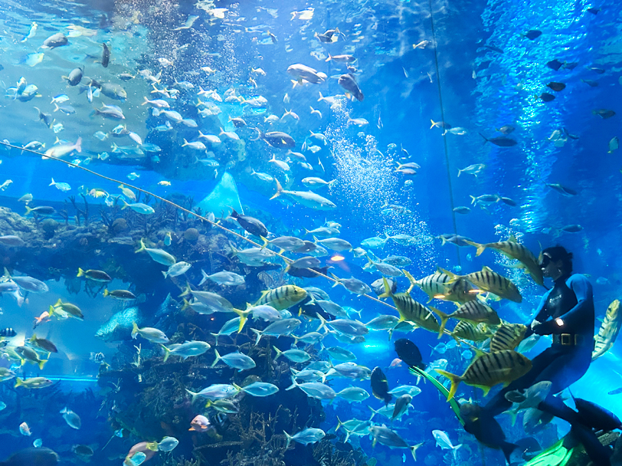 行至中央大厅,巨大的亚克力幕墙豁然展开,整片“海”猝不及防撞入眼帘。鲨鱼巡游如沉默的灰色闪电,鳐鱼舒展双翼滑过头顶,仿佛山峦移动;成群的银鳞小鱼倏忽聚散,变幻出流动的几何图案,仿佛被无形之手指挥的银色交响。我贴在冰凉的玻璃上,看一只海龟慢悠悠划水,眼神沉静如古井,它背负着亿万年的时光密码,在人造的洋流里,竟也游出了几分从容不迫的禅意。
