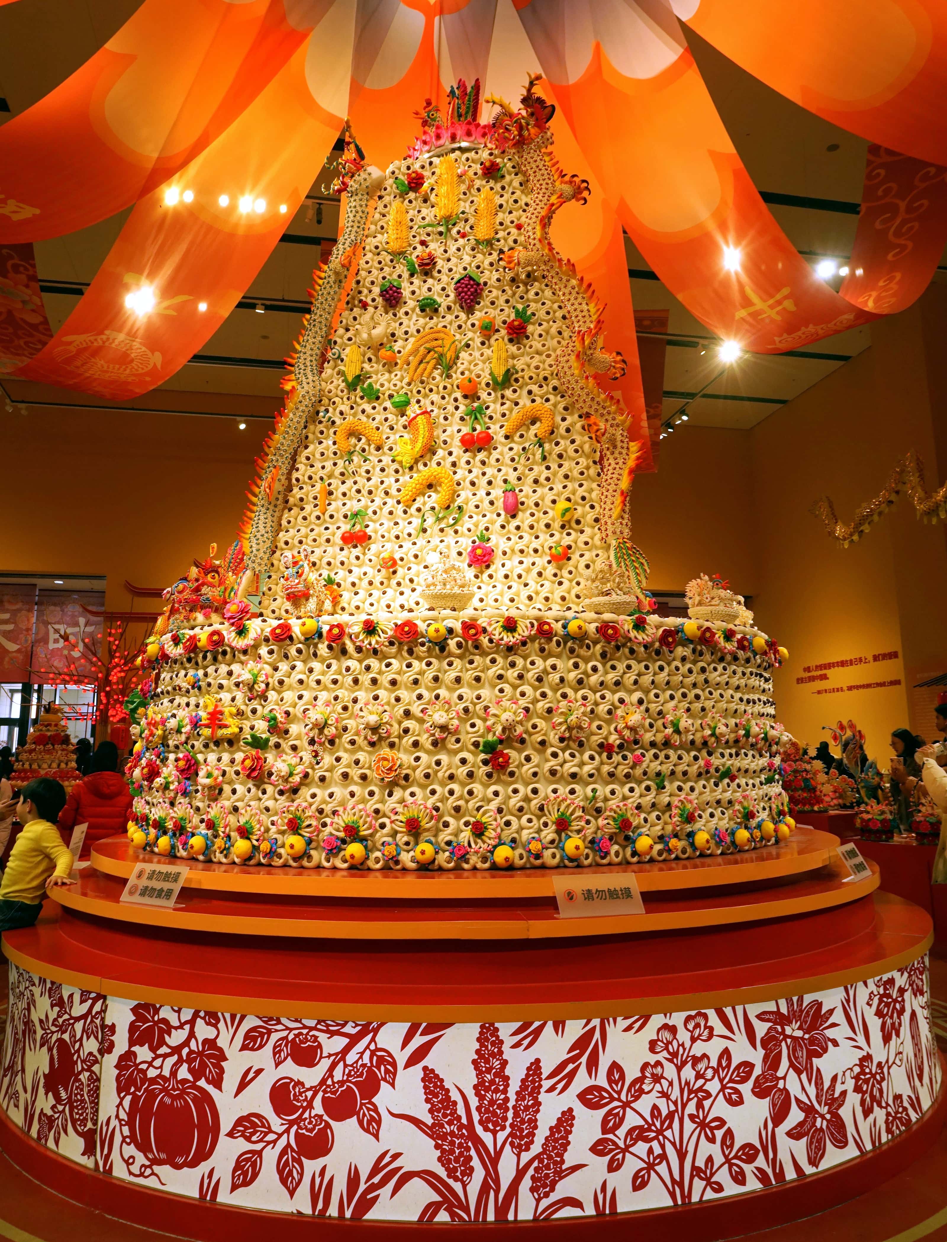 最让人驻足惊叹的,莫过于中央大厅那座气势恢宏的花馍山。高达4.5米的“大鼓枣山”,是北方民间花馍艺术的集大成之作,远远望去便已震撼人心。每一个花馍都饱含着节日的喜庆与匠人的巧思:娇艳多姿的鲜花馍栩栩如生,形态各异的花脸馍妙趣横生,还有惟妙惟肖的农作物、瓜果造型,精巧得让人不忍触碰。谁能想到,平日里朴实的北方面食,竟能化身登堂入室的艺术精品,成为馆中人人争相打卡的非遗奇观。