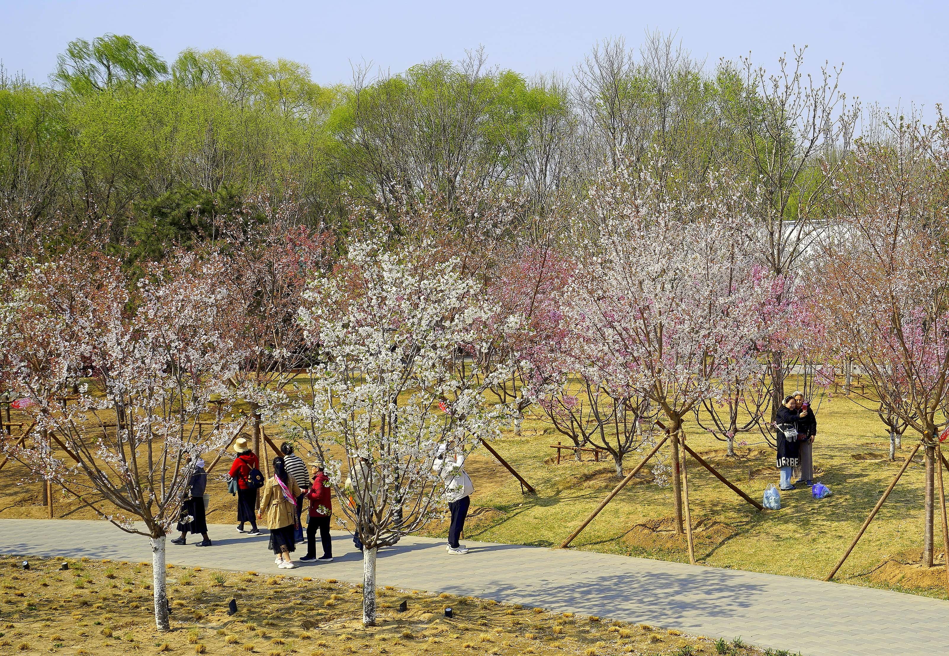 北小河公园春日繁花盛开,市民赏花、拍照、休闲,营造出惬意春日氛围。