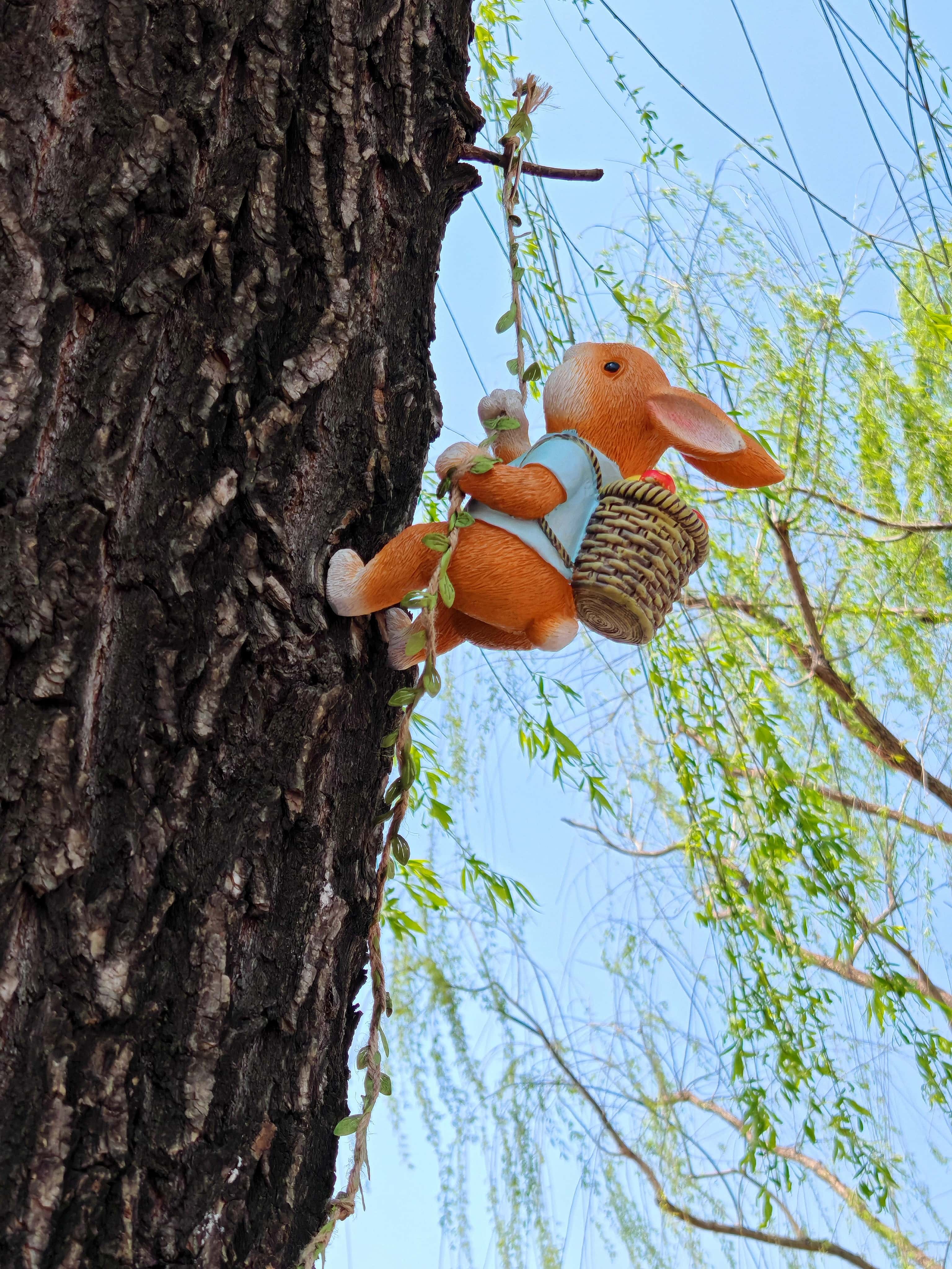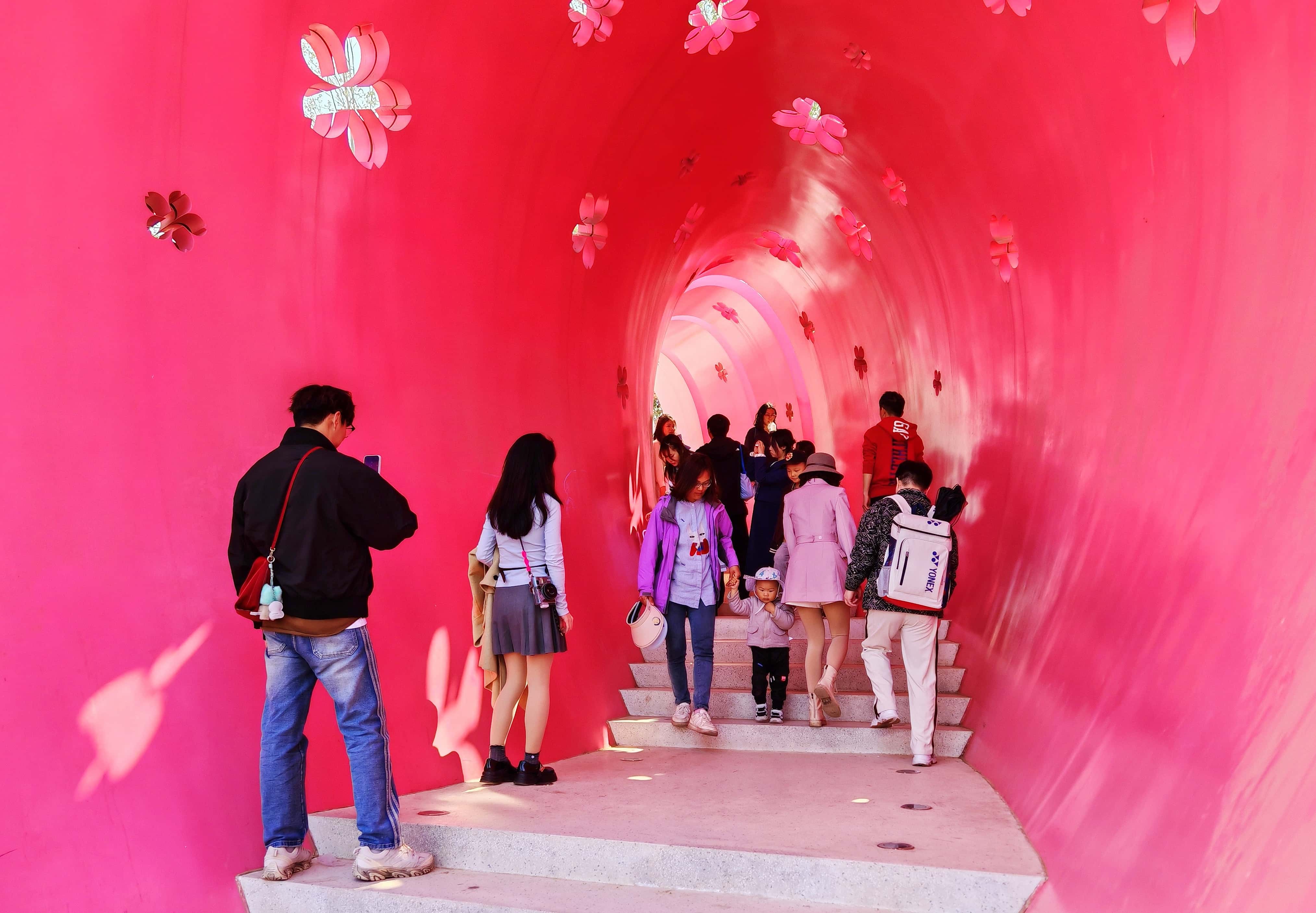园内还藏着不少别致的景观,老树干上攀着柳枝的小兔子摆件、花丛中立着的创意门扇,还有造型独特的喇叭口阶梯,都引得游人驻足观赏、拍照留念。大家沿着阶梯缓步上行,探寻视野更佳的取景地,在趣味景致中收获别样乐趣。