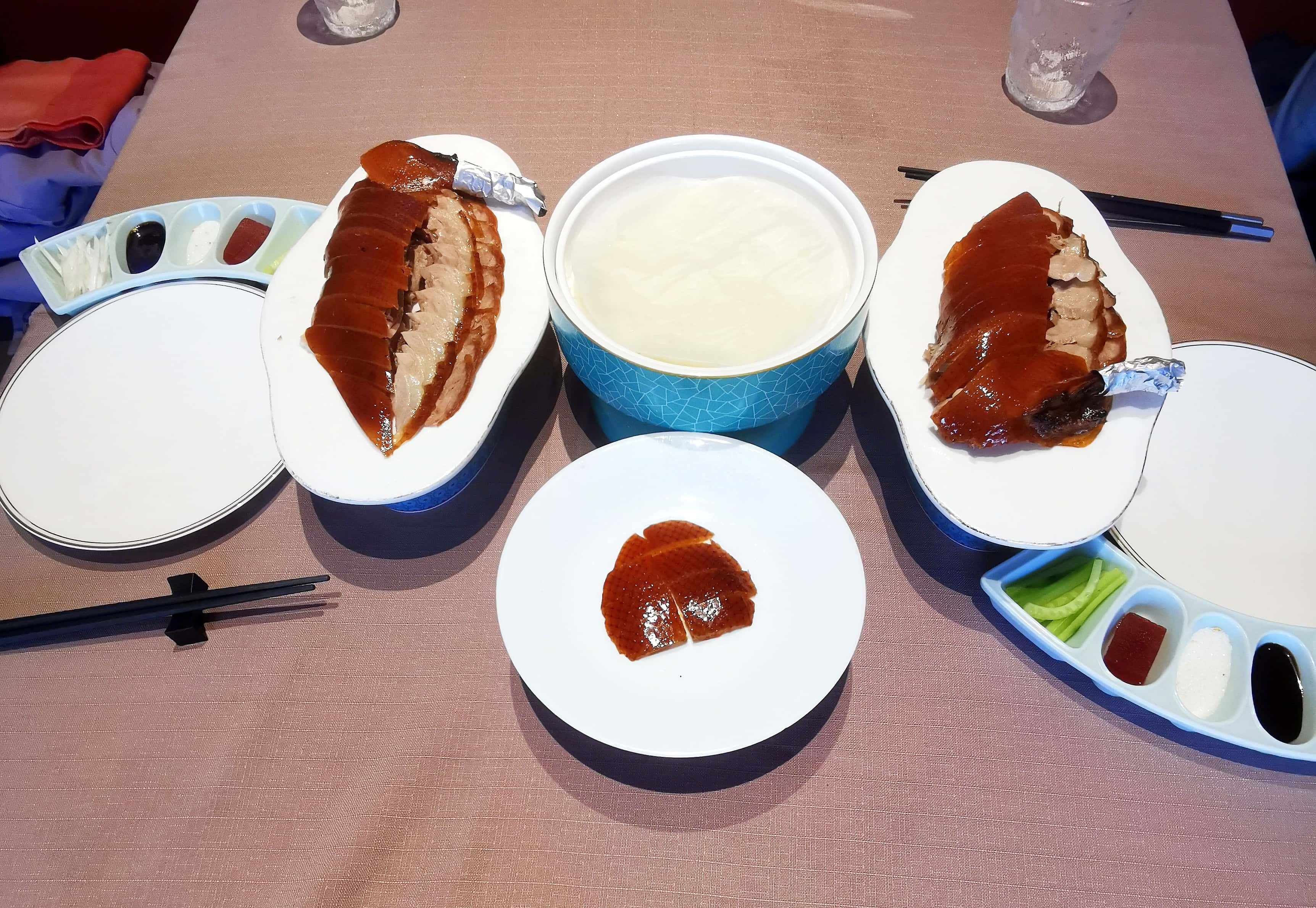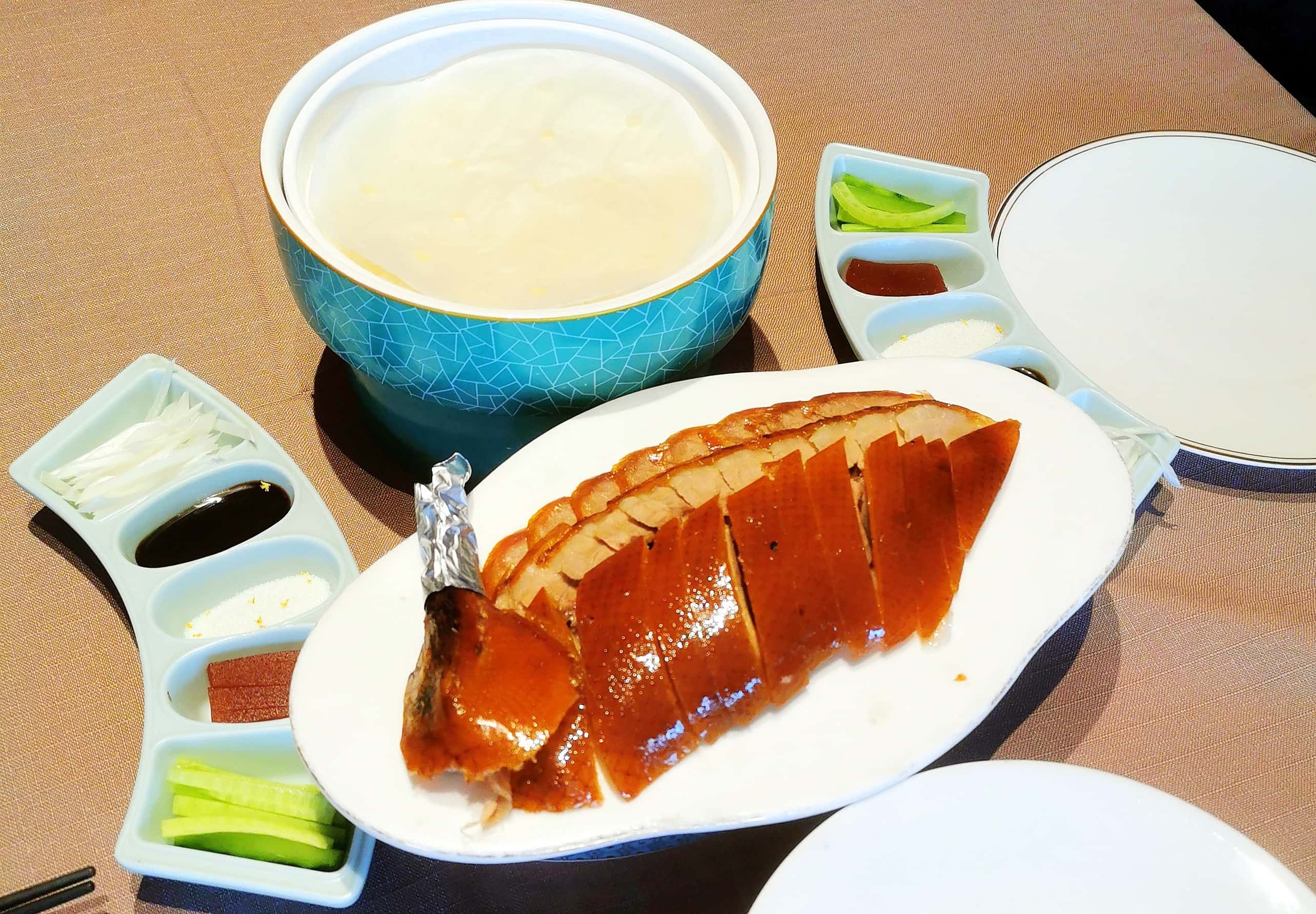 北平食府•北京烤鸭以简约手法还原京味烤鸭,融合春饼、烤鸭、乾隆白菜,展现地道风味与创新体验。